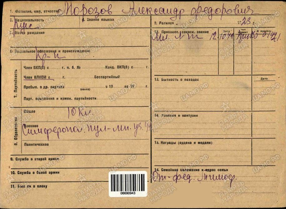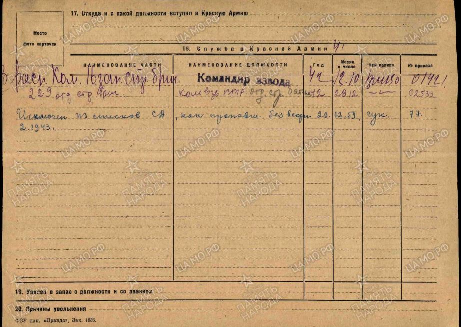 | 1923 г. р.,Кукуево, Ильинский район,Калининская обл.,призван Ильинским РВК 07.07.1941 г. в ряды Советской армии,на фото 15.10.1942г в г. Сердобск Пензенской области,где он проходил службу и обучение,получил звание мл. Лейтенант,прошел курсы мл. Командного состава. Далее с сайта «Память народа» видно,что воевал в 229 ОСБР,пропал без вести февраль-май 1943год. По версии родных погиб в Сталинграде,однако 229 осбр вела бои под Ворошиловградом. |