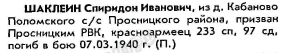 Ищу информацию о прадеде- Шаклеина Спиридона Степановича, Кировская область.Финская война |