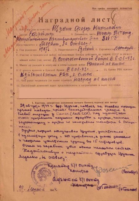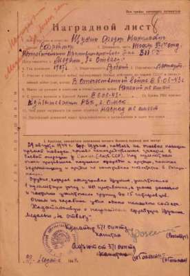 Медаль «За боевые заслуги» Наградной документ