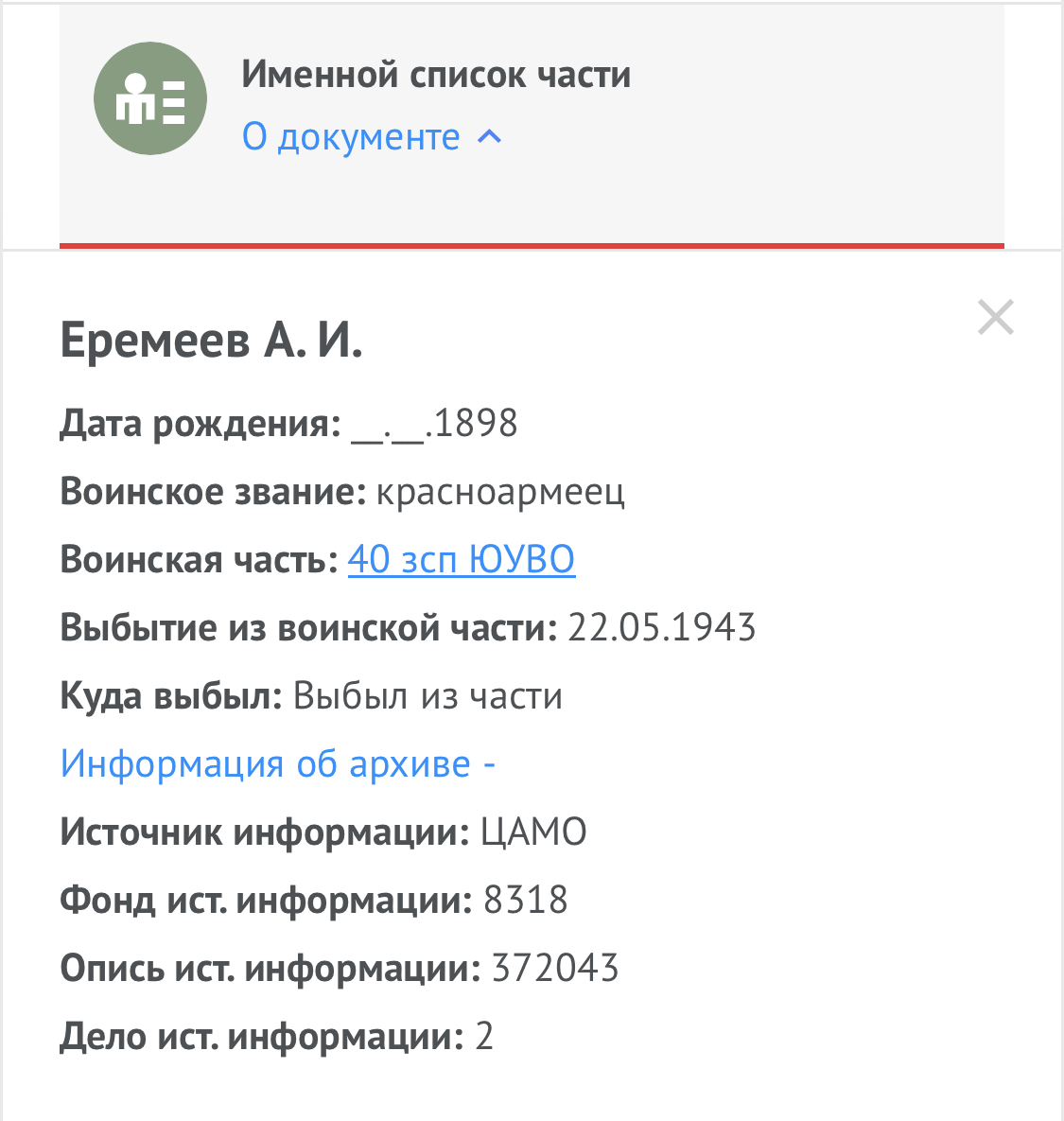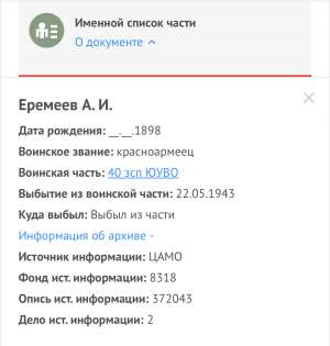 22.05.1943 выбыл из части 40зсп ЮУВО