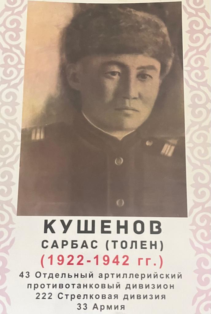 | Кушенов (Кошенов) Сарбас (Толен) Кушенович, родился 1922 году, в селе Ленин, Сарыагашского района, Чимкентской области, КазССР. Был призван в 1941 году, в 33 армию, 222 стрелковая дивизия, 43 отдельный противотанковый дивизион. Прошу дать уточненную информацию о месте гибели. |