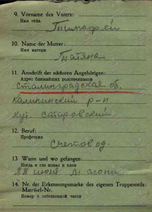 1921гр, рядовой. Родился: Сталинградская обл. Калининский р-н, х Сатаровский.