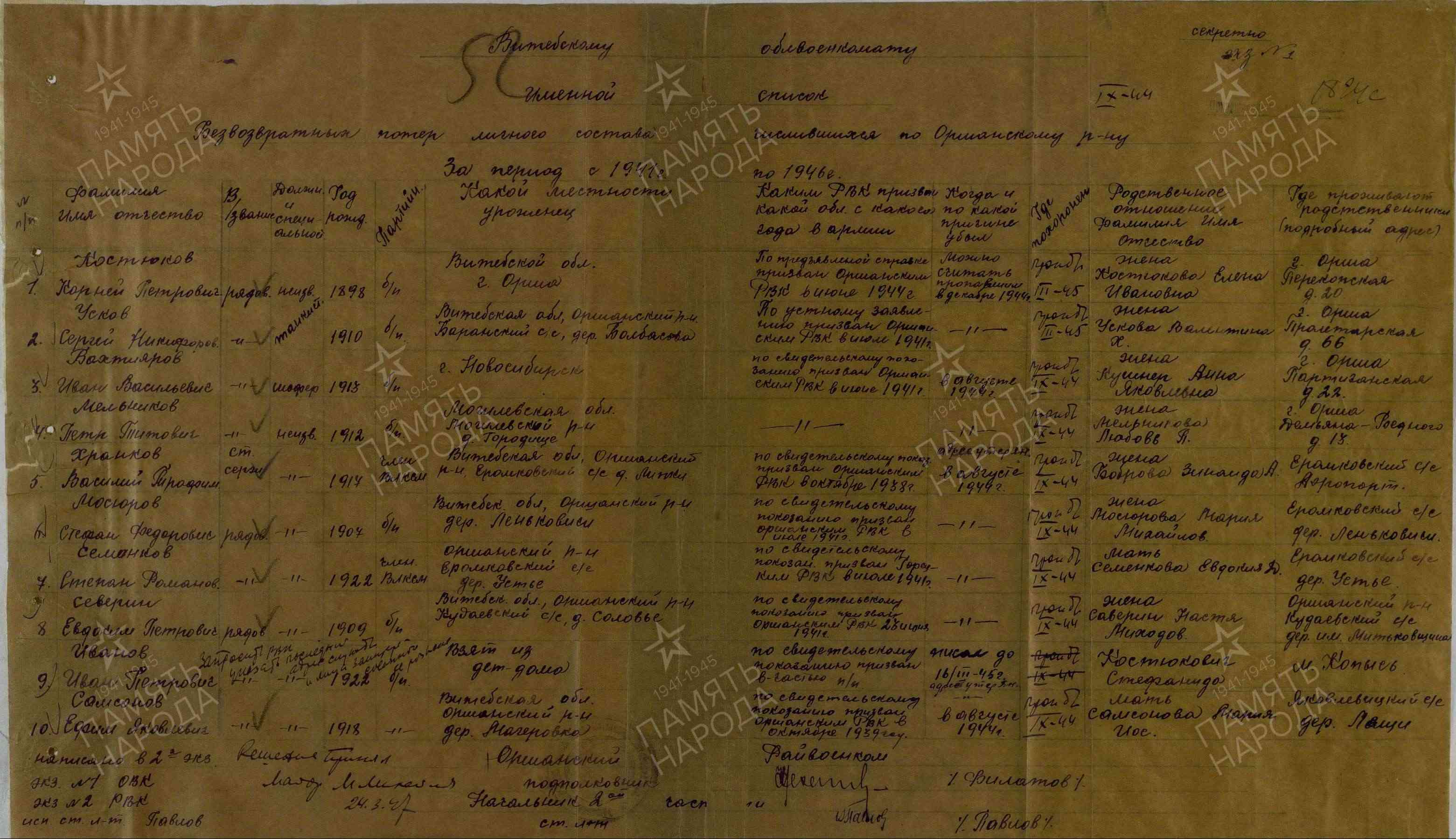 Дата и место призыва __.06.1941 Оршанский РВК, Белорусская ССР, Витебская обл., Оршанский р-н