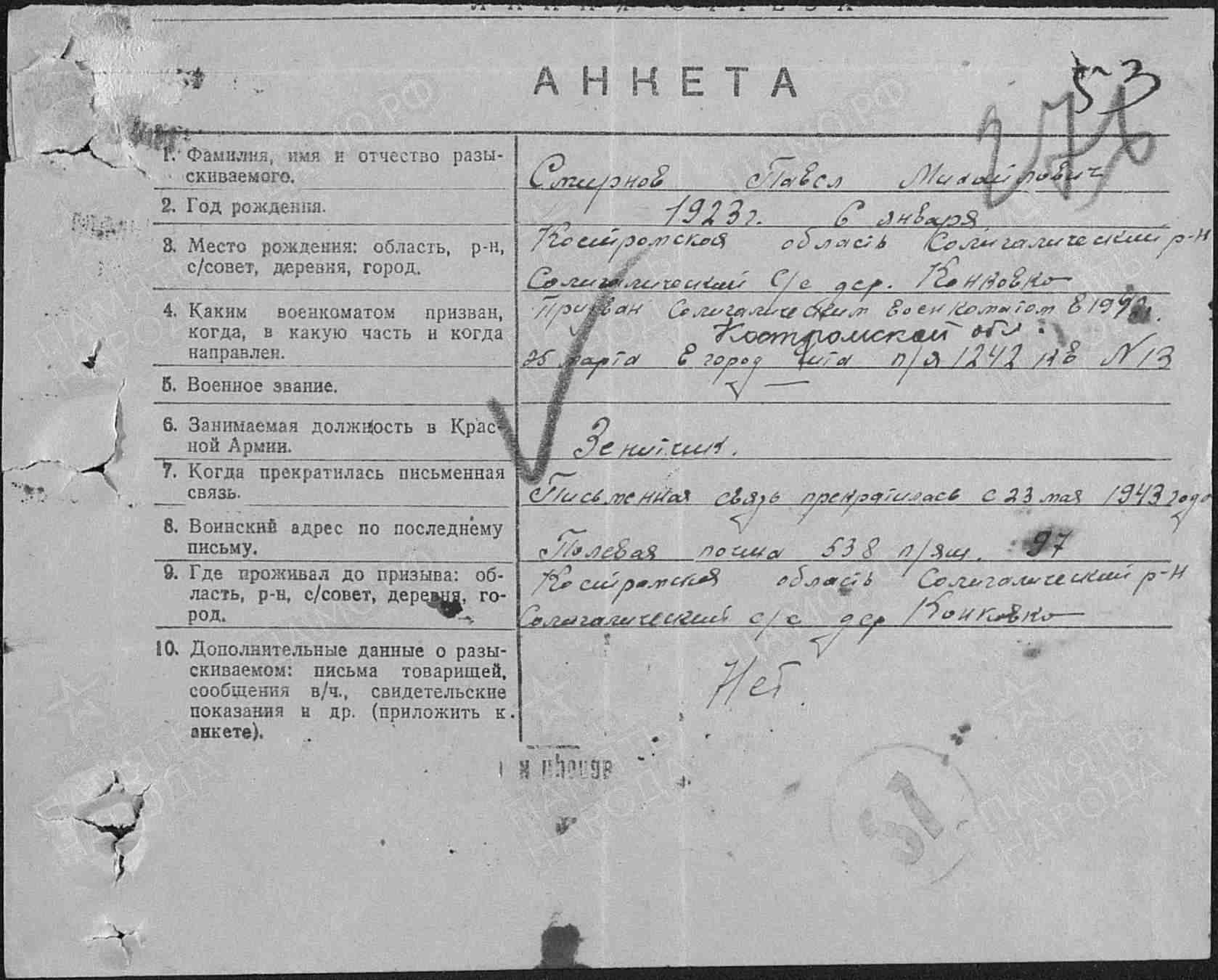 Ищу информацию о Смирнове Павле Михайловиче, родился в деревне Конковка Солигалического района 6.01.1923.