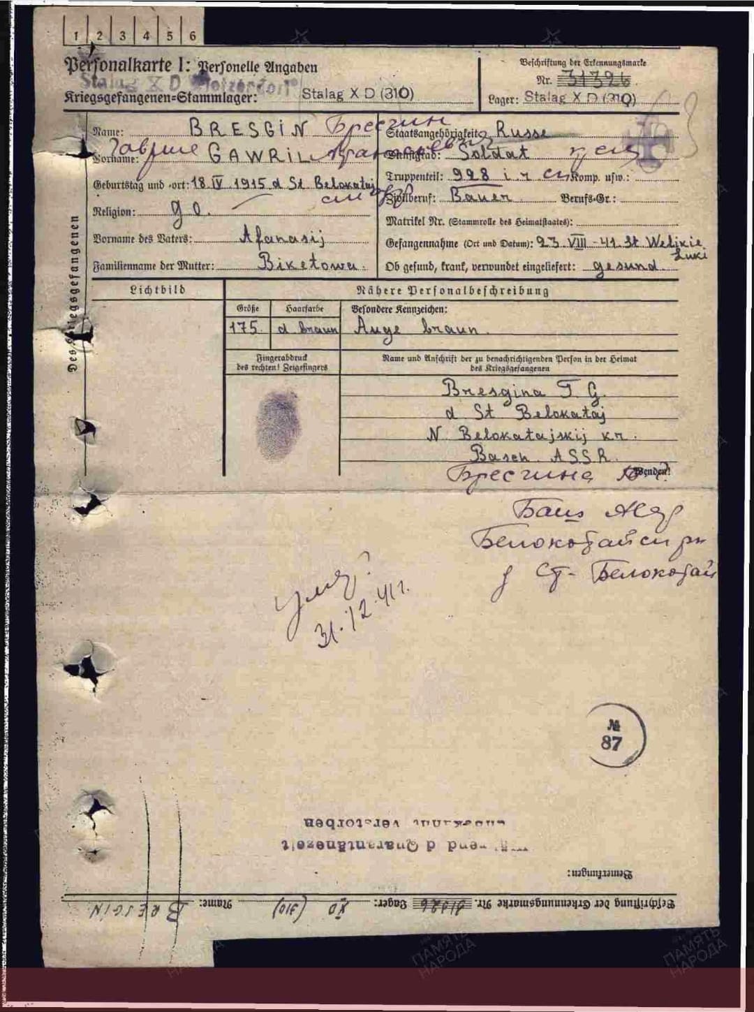 | Добрый день! Помогитете, пожалуйста, найти информацию про моего прадедушку. И место захоронения. Нашли данные о нем на сайте память народа. В немецких документах дед записан как Бресгин Гаврила Афанасьевич.