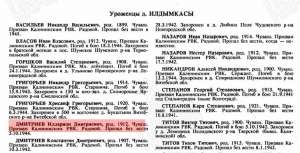 | Здравствуйте! Помогите, пожалуйста,найти прадеда Дмитриева Иллариона Дмитриевича 1912 года рождения.Уроженца Чувашской АССР д.Илдымкасы.Жену его звали Дмитриева Варвара Тихоновна.Бабушка моя про него ничего не знала,т.к.когда он ушёл на войну ей было всего три года.На тот момент у него было двое детей моя бабушка Анна и её старший брат Иван,его к сожалению я не знала,он умер.Единственное что бабушке говорили,то что Илларион Дмитриевич где-то захоронен за границей,но она не знала правда это или нет. |