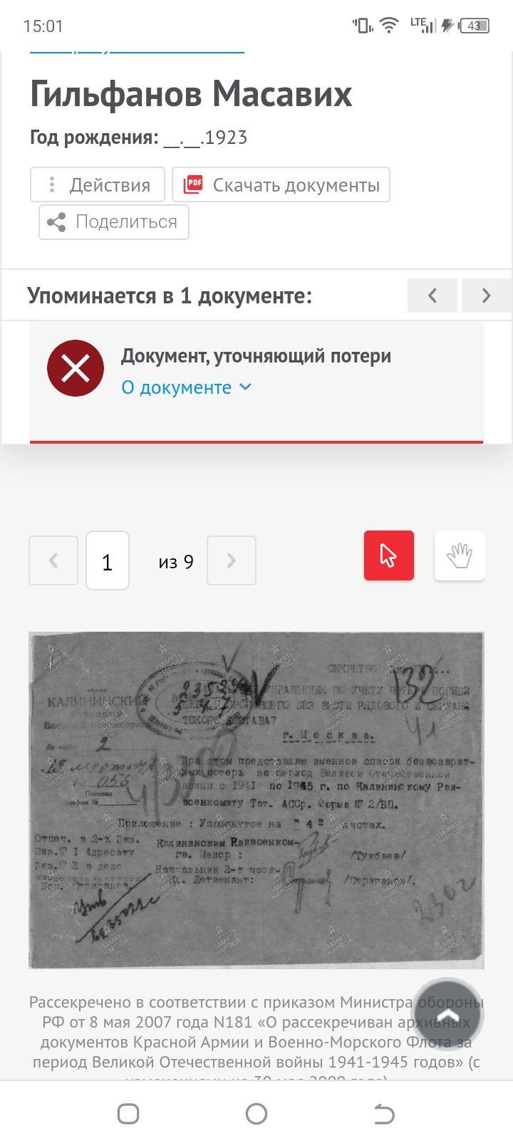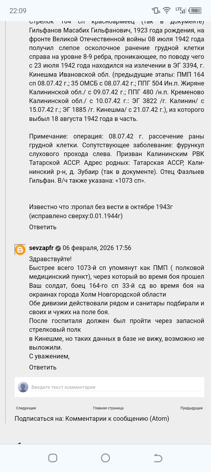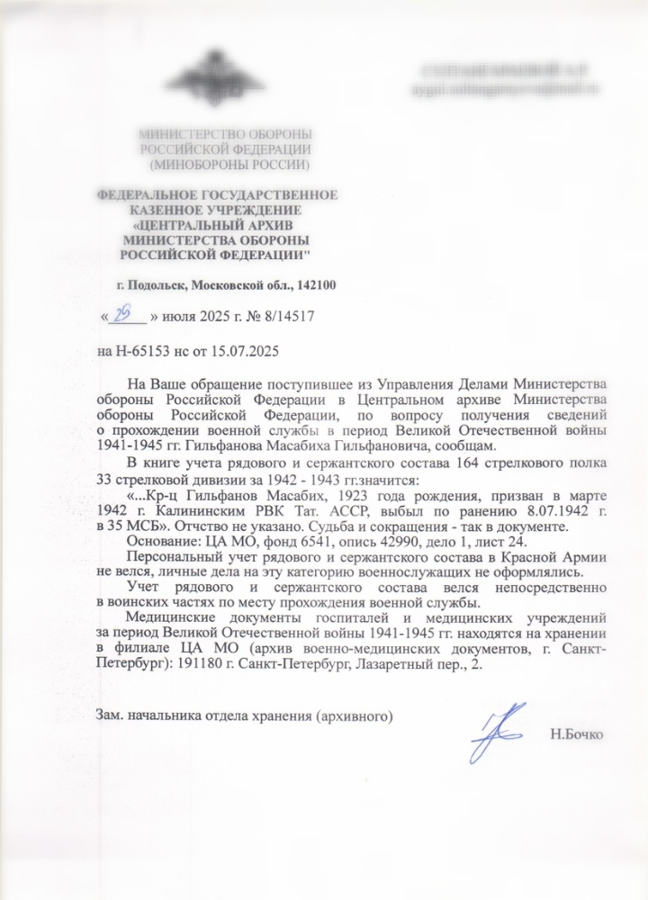 Здравствуйте, спасибо большое за ваш ответ! Я 3-ды обращалась ВАМИ(по адресу г. Подольск, Московская область, 142100) На первое обращение получила ответ(по поводу прохождения дедушки военной службы 164 сп 33сд) После получения мед.справки(ранение, операция, после госпиталя куда он выбыл(в/ч:1073 сп) Второй раз обратилась в ЦАМИ(по адресу г. Подольск..) Ответа не получила, в декабре 2025г.дублировала своё обращение.. Все ещё жду ответа.. На сайте"Подвиг Народа"1000страниц с фамилиями Гильфанов-Гильманов(всех их просмотрела), искала информацию в отчетных данных боевых действии 8гвард.стрел.дивизии(1941-1942г), книги Бауржан Момыш улы прочитала(там есть данные только до февраля 1942г), на страницах"Форум поисковых движении:8 гвардейская стрелковая дивизия":есть сведения боевых действии этой дивизии. Админу этой страницы я тоже обращалась, мне ответили:скорее всего 1073 сп упомянут как ПМП..
