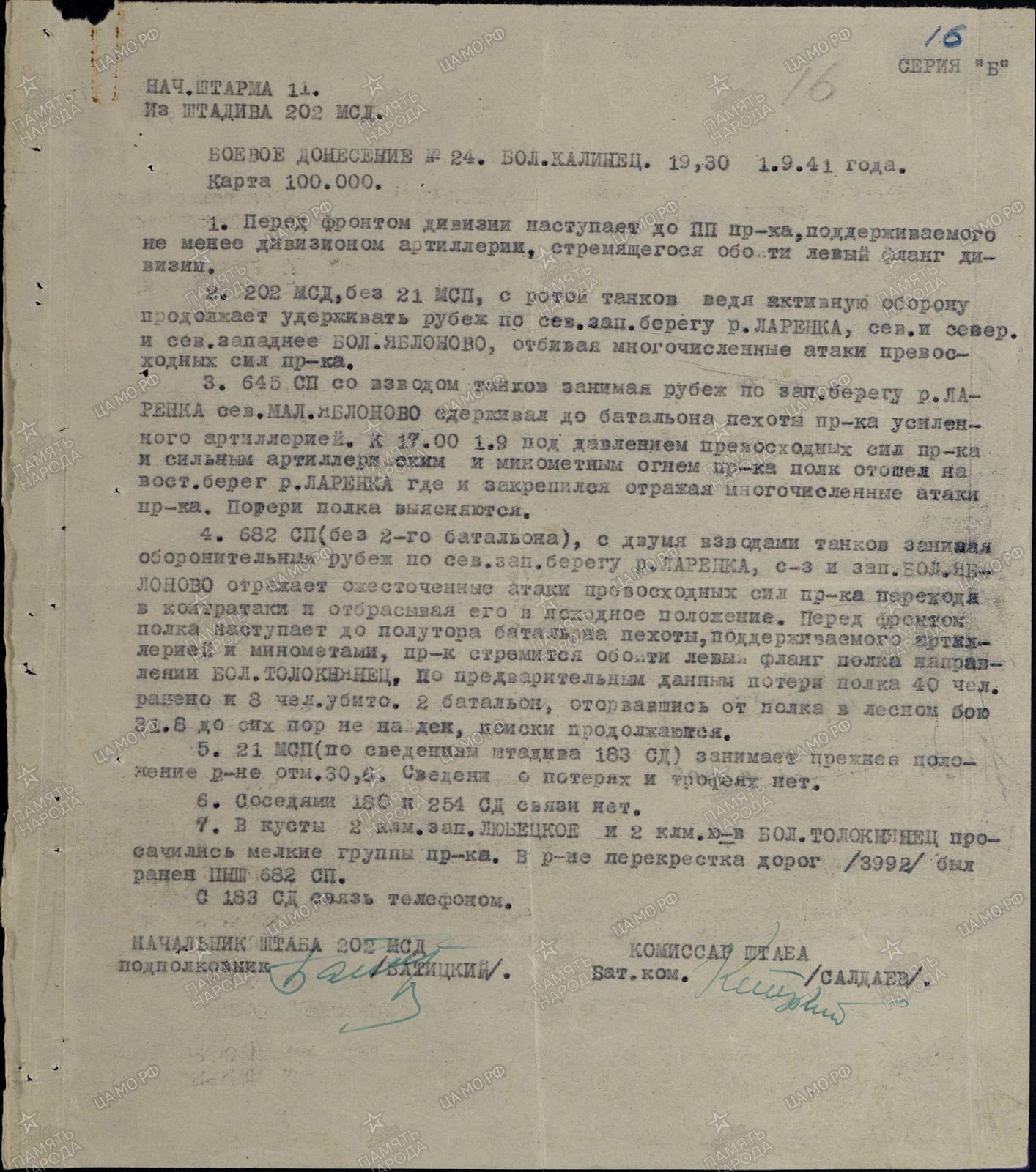 Из просмотренных стр. 22 и 23 ЖБД 682 СП 202 СД по дате от 26 августа по 04 сентября 1941 года известно место нахождения полка в который записан мой дед .