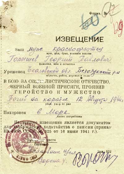 12 августа «Марина Раскова» и тральщики были потоплены немецкой подлодкой, которая применила в Арктике новейшее оружие бесследные акустические электроторпеды, самонаводящиеся на шум винтов кораблей... Так в дом Починковых пришла похоронка.