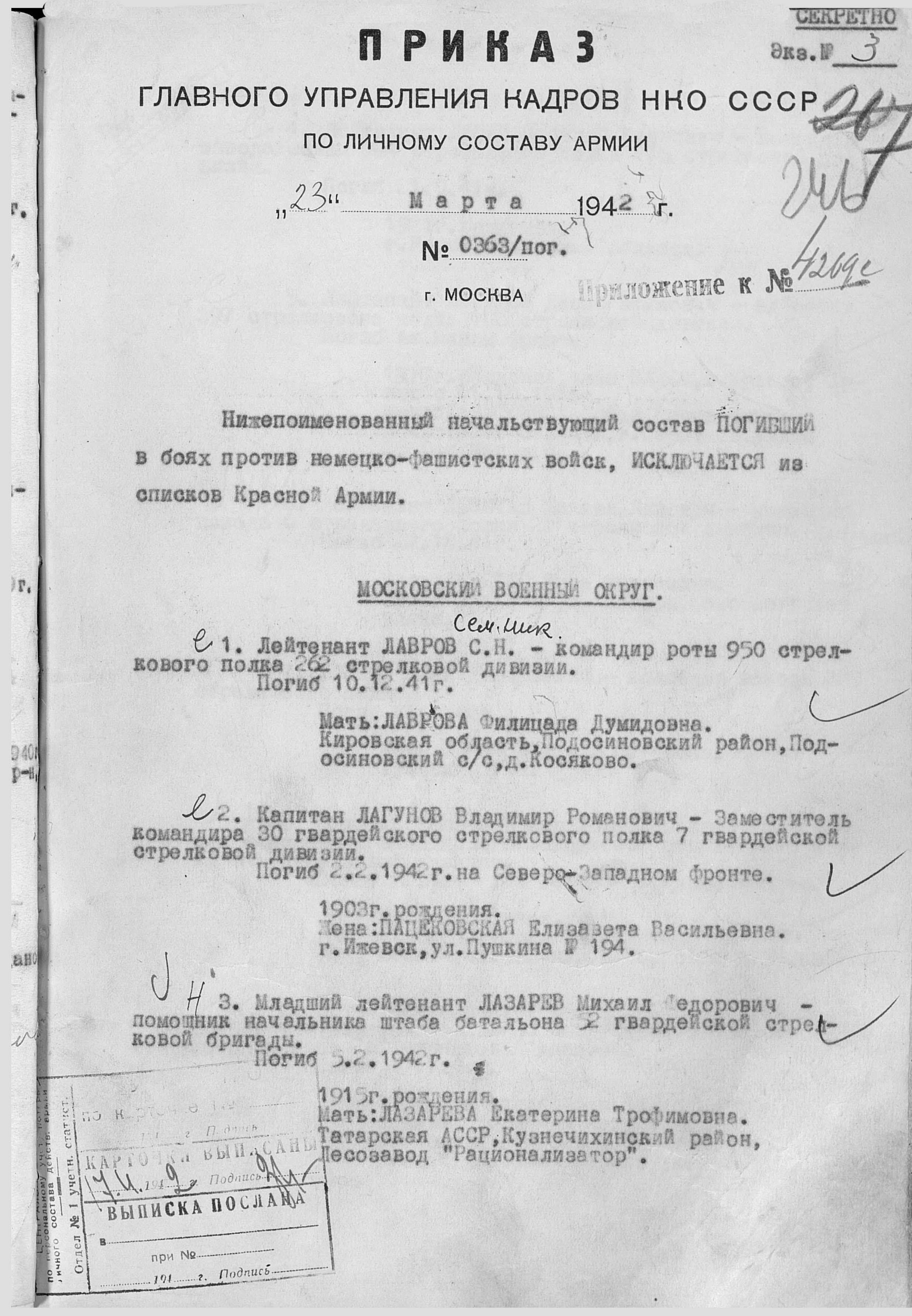 Приказом ГУК НКО СССР по л/с 5-й Армии от 23.03.1942 г. №0363/погибшие, г. Москва, нижепоименнованный начальствующий состав погибший в боях против немецко-фашистских войск, ИСКЛЮЧАЕТСЯ из списков Красной Армии: по Дальне-Восточному фронту, под номером 187, значится – «Левинский Григорий Максимович, командир роты 49 стрелкового полка 50 стрелковой дивизии. Погиб 12.12.1941 г. на Западном фронте. 1916 г. рождения, Уссурийская область, курортный поселок Уссурка».