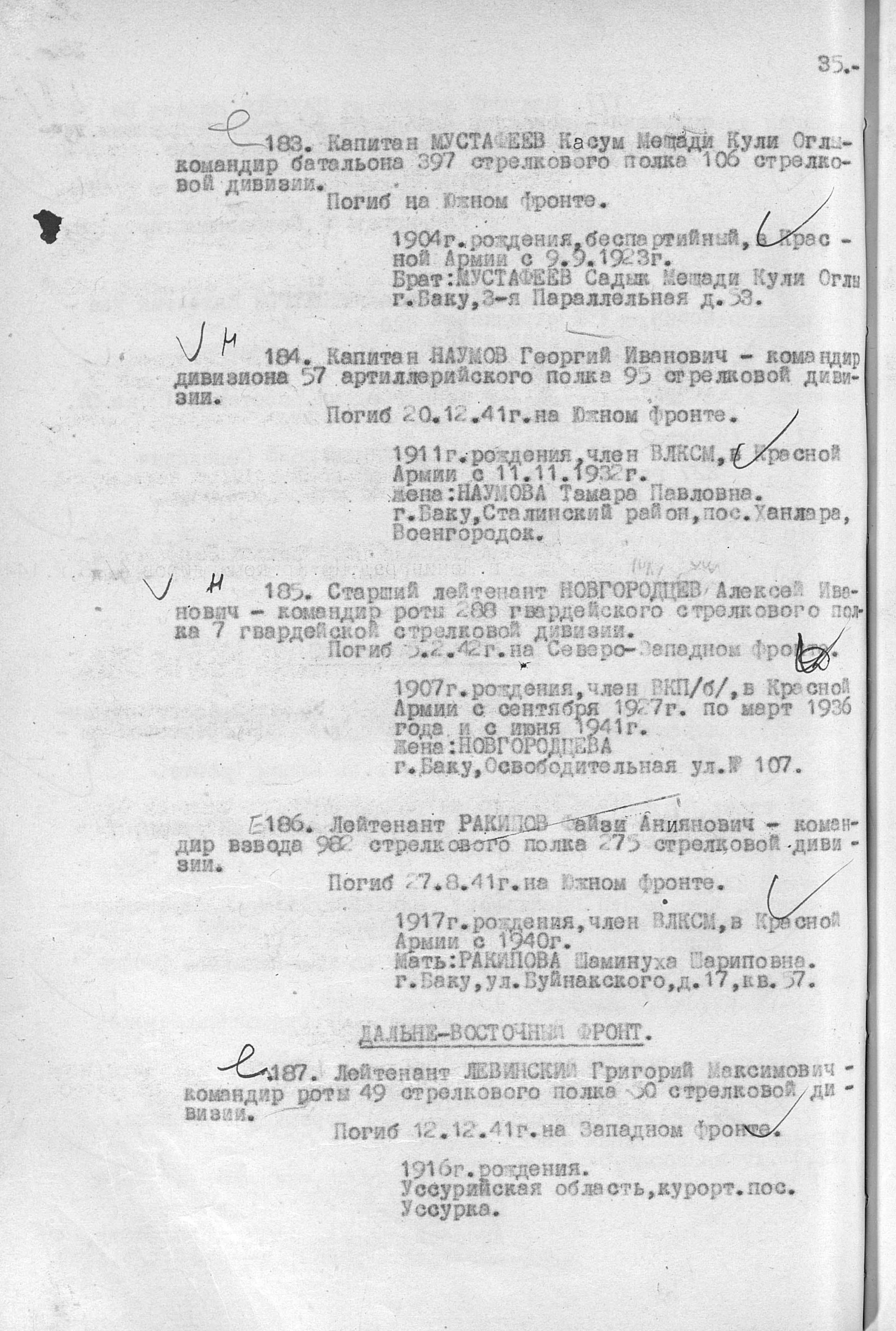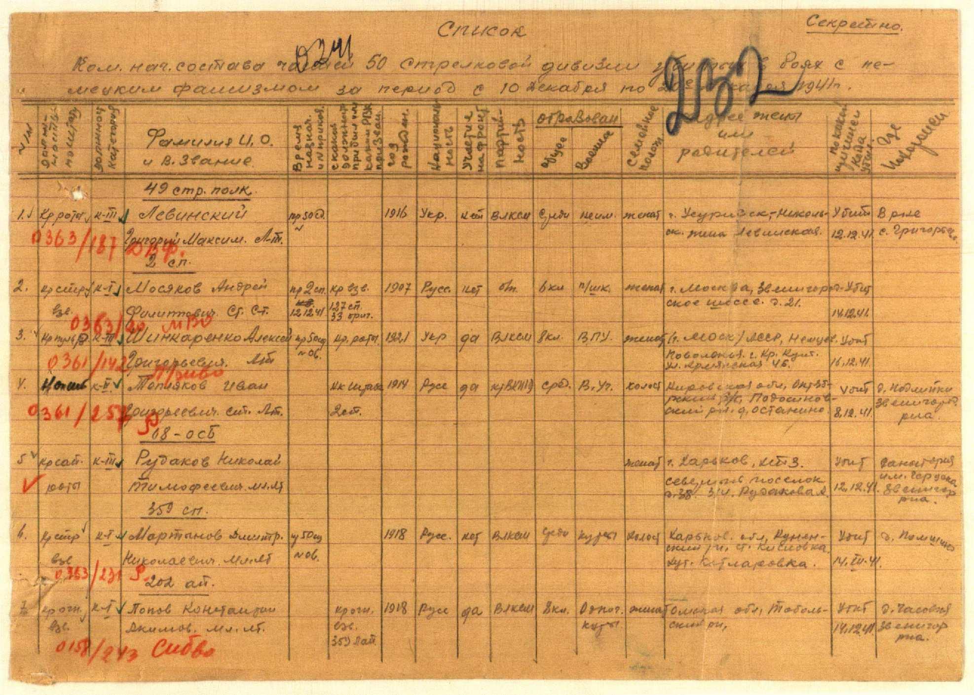 В ЦАМО СССР имеется информация на ЛЕВИНСКОГО ГРИГОРИЯ МАКСИМОВИЧА, 1916 г.р., украинца, члена ВЛКСМ, образование среднее, воинского образования не имеет, лейтенанта, командира стрелковой роты 49 стрелкового полка (СП) 50 стрелковой дивизии (СД), погиб 12.12.1941 года в районе д. Григорово (Западный фронт). Местом жительства погибшего, семьи и жены Левинской (без инициалов???) указан Приморский край, г. Никольск-Уссурийский.
