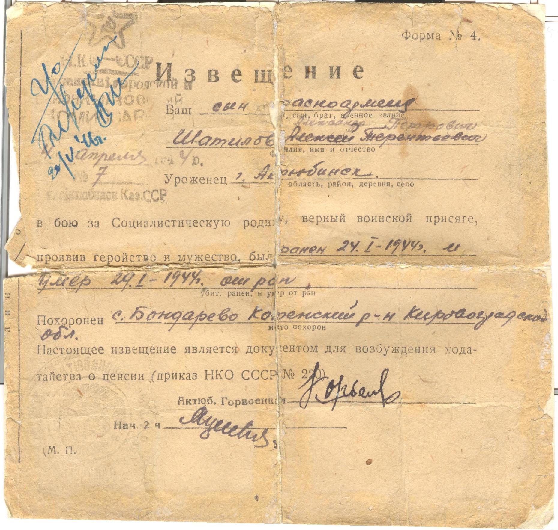 Если у Вас есть дополнительная информация о его гибели, обстоятельствах и месте захоронения, а также о том, какая военная обстановка была в районе сел Несватково и Бондерово во время января 1944 года прошу сообщитьме. Я обращался в военкомат Александровки, но их ответное письмо затерялось... Был бы рад, если у Вас есть возможность обратиться в этот военкомат и попросить у них копии высланных бумаг и фотографии групповой могилы №111, где предположительно захоронен Александр Шатилов. Возможно на мемориале есть его фамилия. Из его семьи в живых осталась только младшая сестра, моя бабушка. Ей в конце февраля исполнится 74 года, и она очень хотела бы узнать судьбу своего единственного брата... Приехать лично на его могилу она уже не сможет, но хотя бы узнать и посмотреть фото. Почтовую пересылку бумаг готов оплатить.