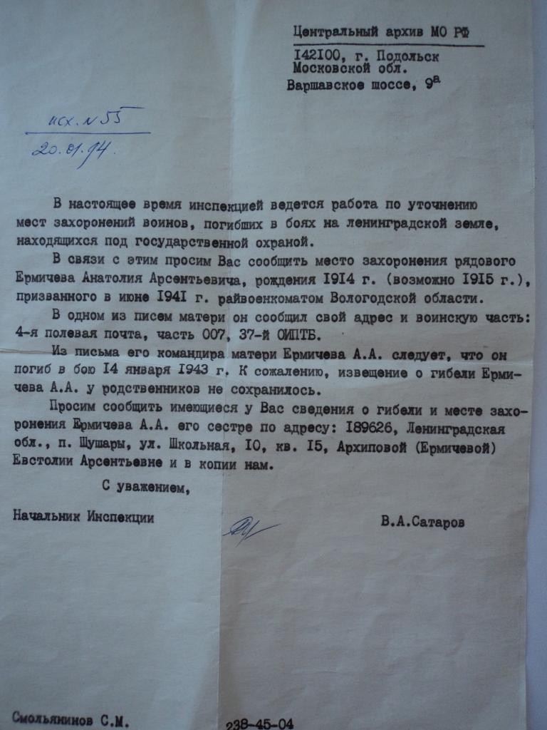 Вам нужно послать еще один запрос в ВСЕВОЛОЖСКИЙ ВОЕНКОМАТ и в администрацию и запросить о наличии захоронения.