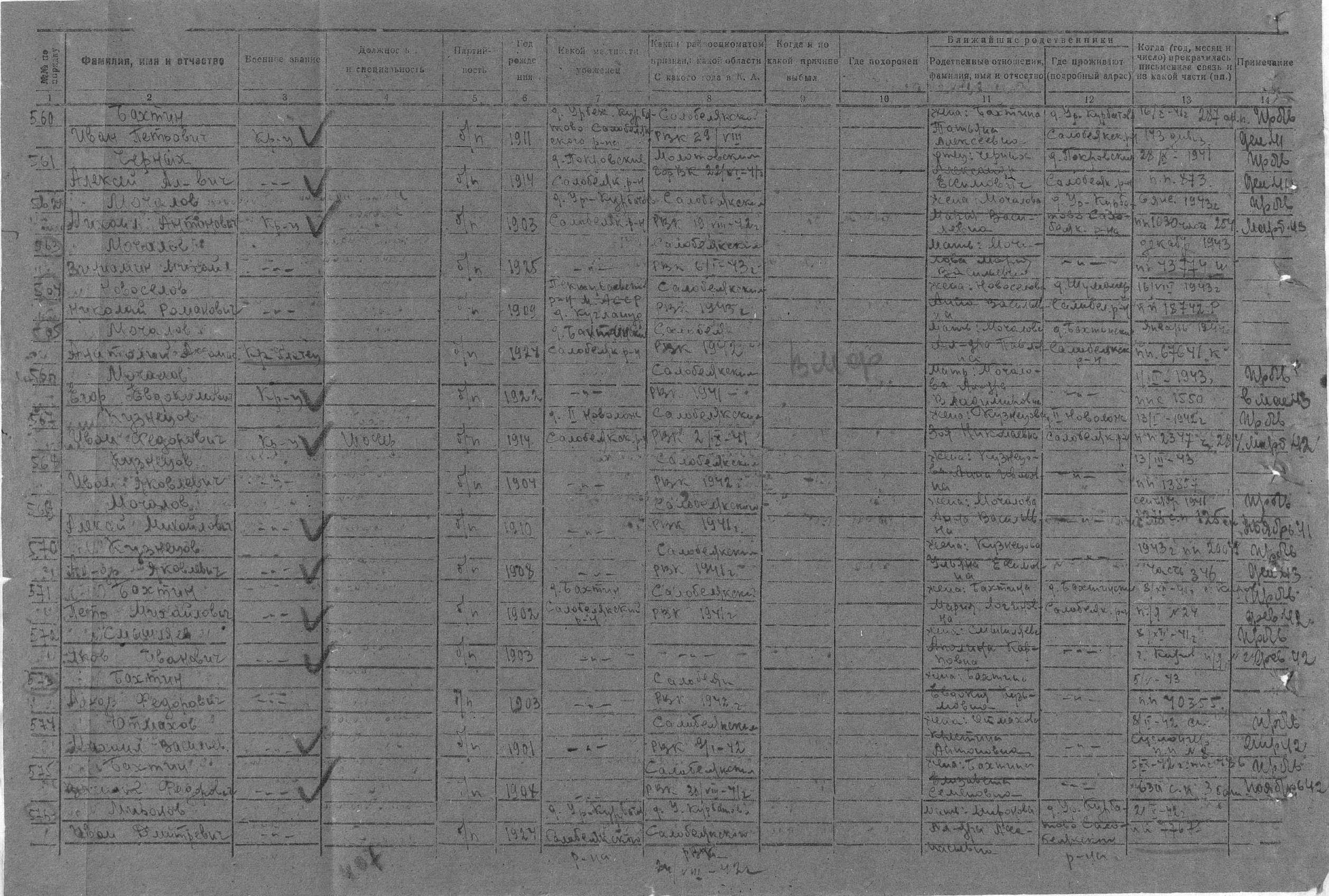 | Бахтин Иван Петрович Год рождения: 1911 Место рождения: Кировская обл., Салобелякский р-н, д. Урбеж-Курбатово Жена: Бахтина (Дождикова, в девичестве) Таисия Алексеевна. Дети: Августа, Игорь Дата и место призыва: 29.08. Кировская обл., Салобелякский р-н, д. Урбеж-Курбатово Последнее место службы: 143 Девизия 287 АП Красноармеец. Причина выбытия: пропал без вести Дата выбытия: _.12.1941 Когда прекратилась письменная связь: 16.10.1941 |