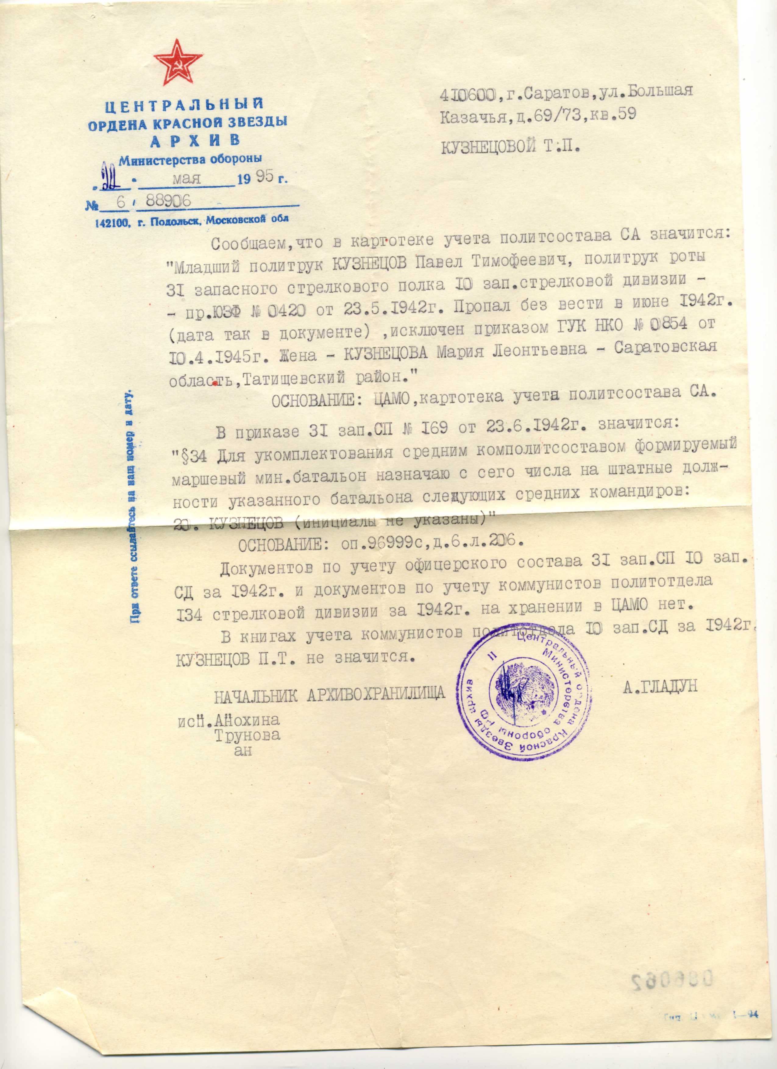 | Кузнецов Павел Тимофеевич 1912г.р. призван в РККА из с. Слепцовка Татищевского р-на Саратовской обл. примернр 1939-1940 гг. Окончил курсы политруков в г. Куйбышев, отслужил в нескольких частях, предпоследняя 134 СД 534 ГП 9 Бат полткуком комбата. Писма приходившие в период 41-05.42 были от п/я 140 из Харьковской, Сталинградской и Воронежской областей по мере передислокации части. Последняя часть службы 10 ЗСБр, 31 ЗСП пропал безвести 28.05.1942г. |