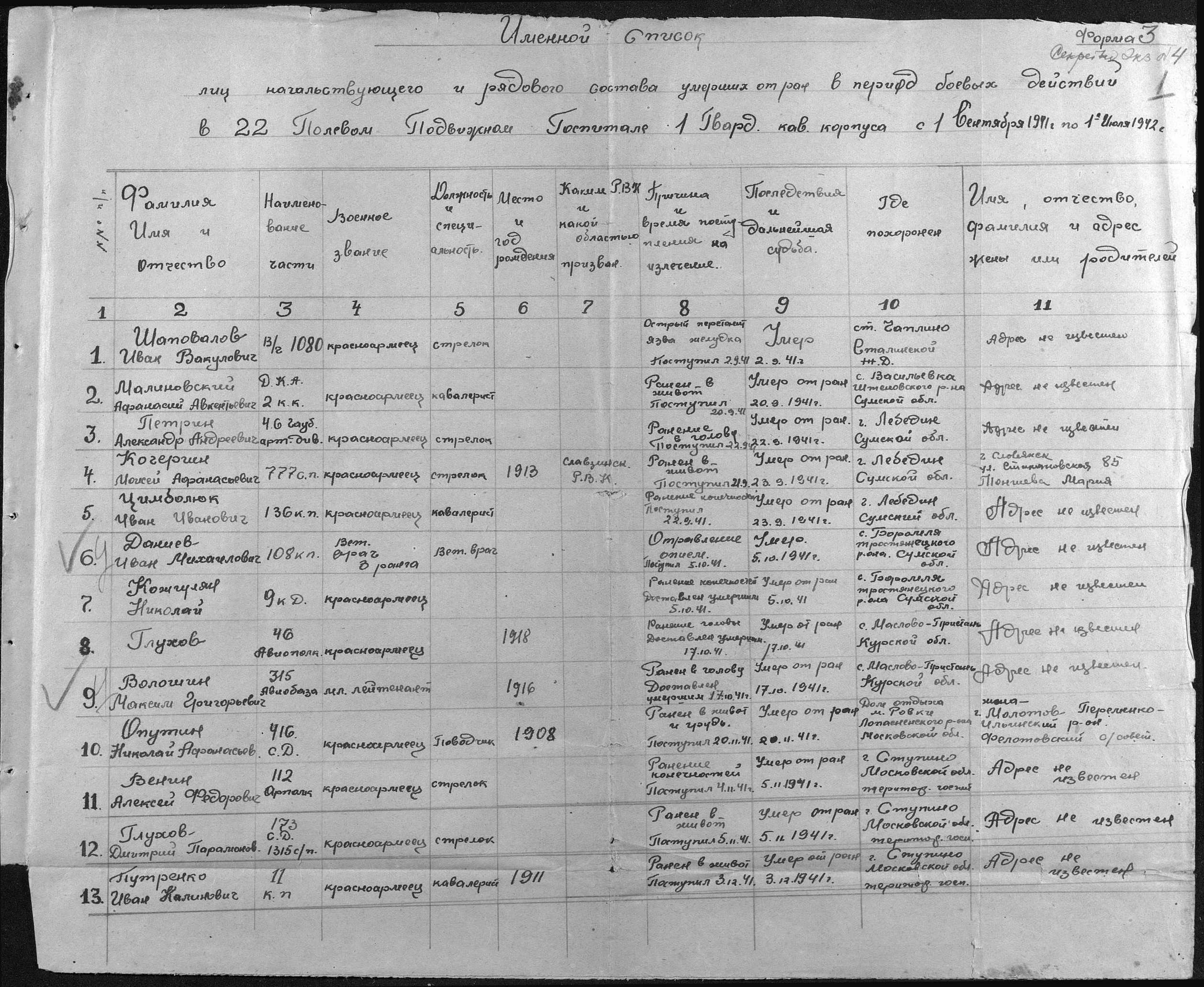 | Обращаюсь от лица моих друзей-поисковиков. На территории нынешнего Никольского храма в Ровках (ранее дом отдыха)Чеховского р-на Московской области находится неучтённое захоронение времён ВОВ. Там покоятся останки Опутина Николая Афанасьевича (по местным архивным данным). С помощью данных ОБД-мемориал установили следующее:1908 г.р., 416 СД, умер от ран 20.11.41 г. в 22 ППГ (передвижном полевом госпитале) 1 Гвардейского кавалерийского корпуса. Нужна вся информация об участии 1 ГКК в обороне Москвы,о 22 ППГ, некоторое время базировавшемся в Ровках. Словом,любая информация может помочь поисковикам. Заранее благодарю всех, кто откликнется. СПАСИБО! |