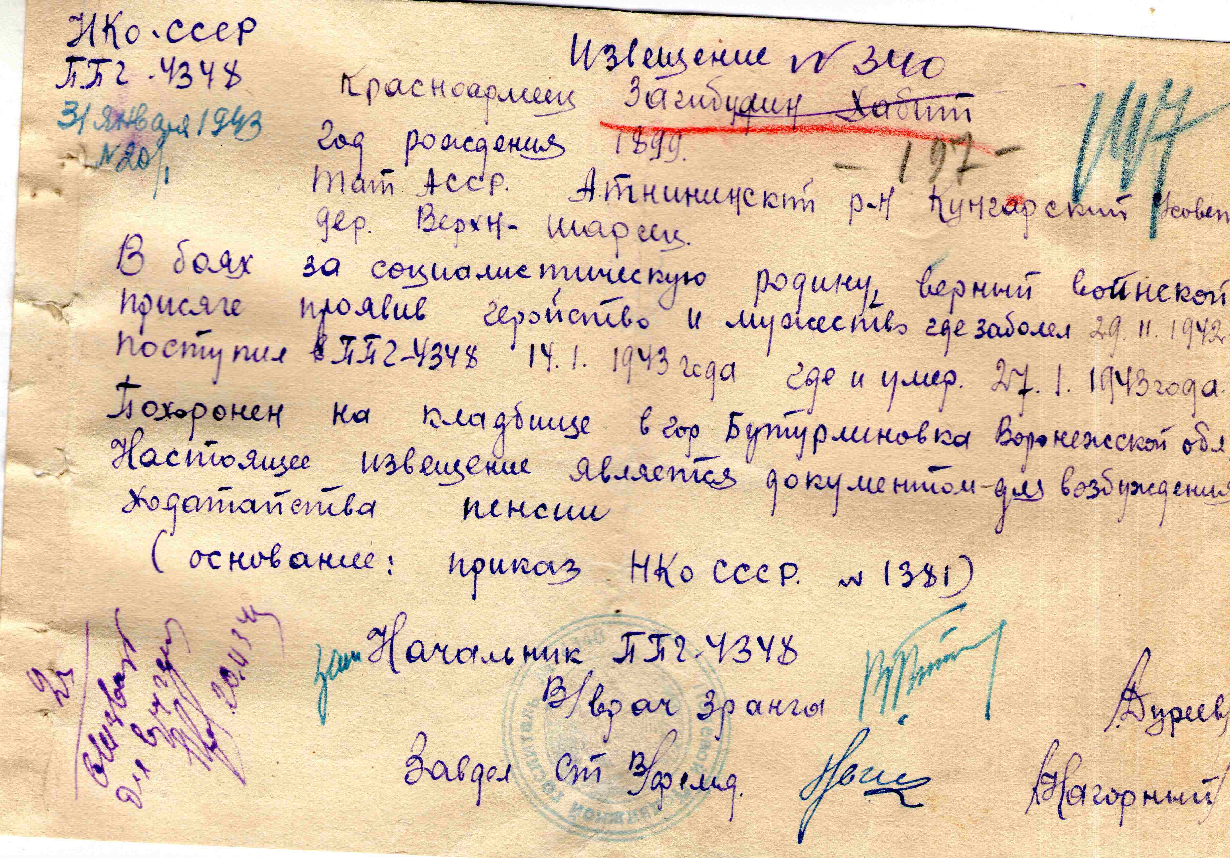Загидуллин Хабибрахман Загидуллович призван 01 февраля 1942 года.В каком полку служил дед и дальнейшая судьба мне неизвестна.Но сотрудник военкомата из архива прислала мне скан следующего дукумента ,который вам отправляю .Имеет ли он отношение к нашему деду? Мама говорила,что дед пропал без вести.Где я могу узнать название полка ,чтобы узнать дальнейшую