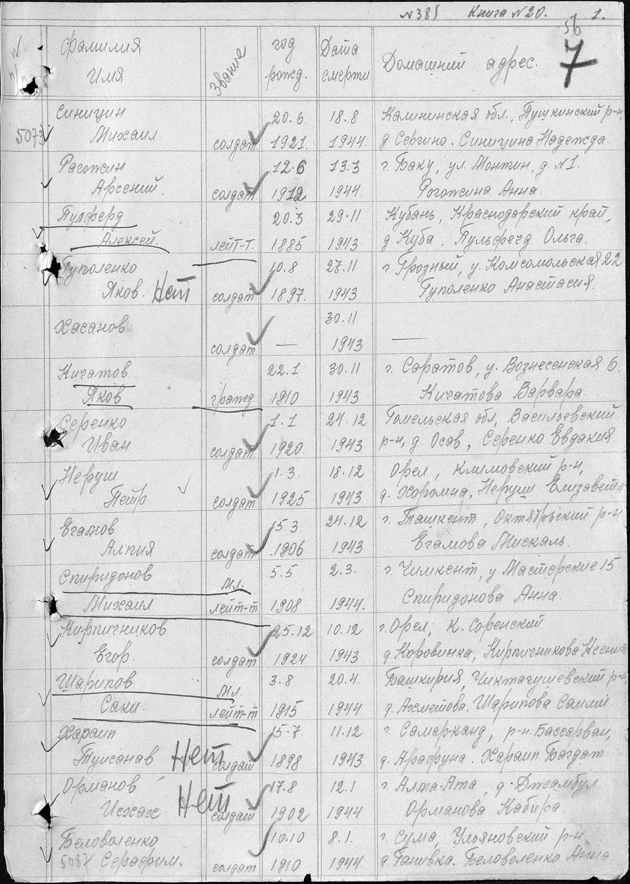 | Добрый день! Очень нужна помощь или подсказка! Мой родственник, Кичатов Яков Иванович,22-01.1910 г.р.,уроженец г. Саратова, погиб в плену, в Шталаге 326 Штукенброк, умер в лазарете Штаумюле от лимфаденита 5 декабря 1943 г. По лазаретной карточке он значится как военнопленный, а в списках умерших как гражданский. Лагерный номер отсутствует. Как теперь установить, где конкретно он был взят в плен,откуда прибыл в концлагерь, сколько там находился до момента гибели. Спасибо всем,кто откликнется. |