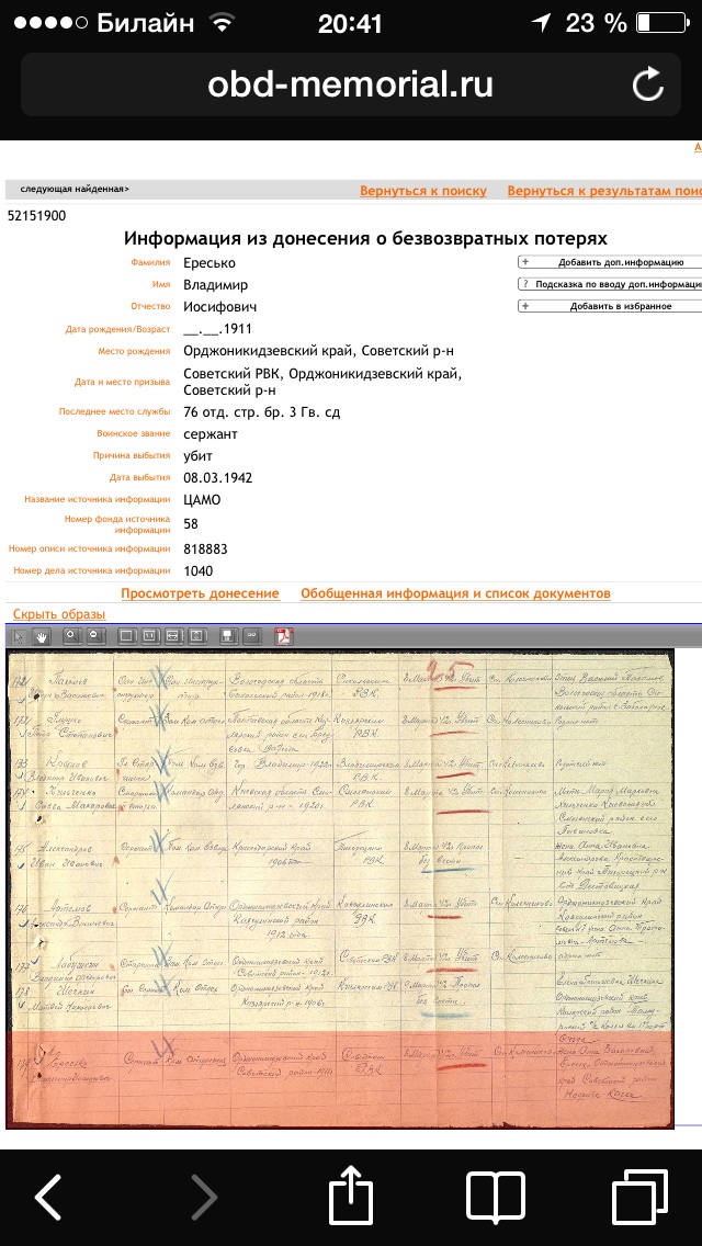 | Здравствуйте! Помоги мне пожалуйста. Дело в том что я ищу могилу своего прадеда,который погиб 8 марта 1942 года в селе Колесниково Ростовской области . На аллее славы в Матвееве Кургане его имени нет. Помогите найти могилу и возможно какие нибудь документы,кроме записи в донесение.Буду признательна за помощь. Ересько Владимир Иосифович 1911 года, Орджоникидзевский край, Советский район. Жена Ересько Анна Захаровна,76 отд.стр.бр. 3 Гв.сд |