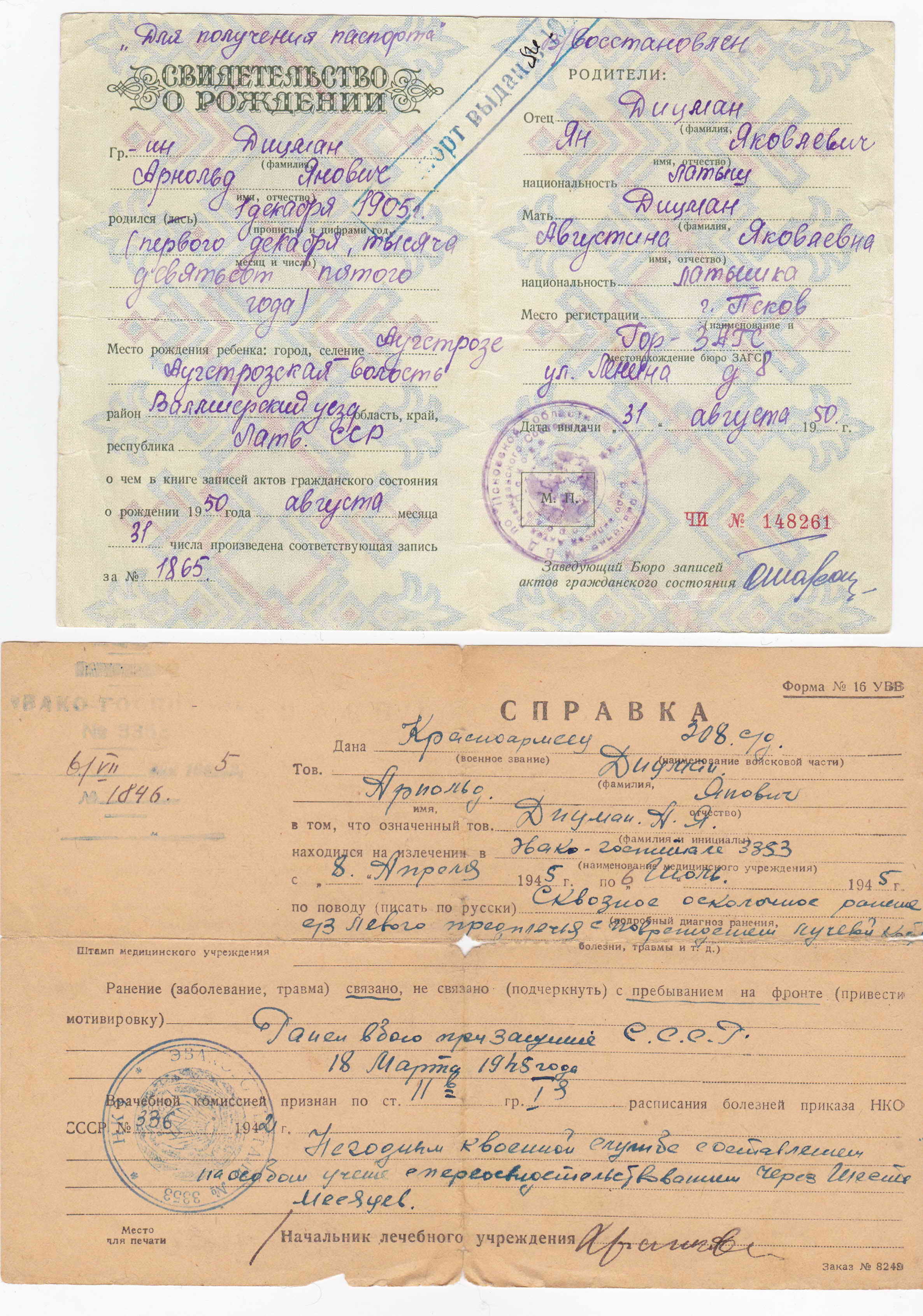 | Дицман Арнольд Янович, родился 1 декабря 1905 года в Л.ССР. Волмерский уезд, Аугстрое (если, конечно, я правильно прочитал)( в приложеном фото это всё написанно).Жена-Александра Юлиусовна( записанно в красноармейской книжке). 308 Латышская стрелковая дивизия, 355 стрелковый полк, транспортная рота.