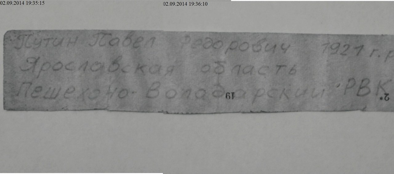| В конце июля в Краснооктябрьском районе города-героя Волгограда обнаружено захоронение советских солдат, которое оказалось самым крупным из всех, что отыскали здесь за последние 15 лет. На самом дне воронки, в гильзе от патрона найдена записка, написанная рукой гвардии красноармейца, стрелка 39 Гвардейской стрелковой дивизии Павла Федоровича Путина из деревни Юдино Пошехонского района, убитого в бою за Сталинград в декабре 1942 года.