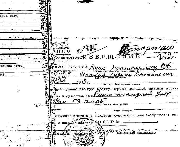 | Помогите пожалуйста найти место захоронения моего прадеда Исакова Кузьмы (Козьма по довоенному удостоверению личности) Степановича и если возможно воинскую часть в которой воевал мой прадед. Место рождения д.Микеровщина Халтуринского с/с Кировской области. Призван Макарьевским РВК. Известно из воспоминаний бабушки, что прадед воевал под Сталинградом. Имеется похоронка от мая 1943 (повторная), что прадед умер от ран в 53 омсб, а где это было и как (где похоронен, при каких обстоятельствах ранен, даже в какой части воевал за нашу Родину) сведения отсутствуют. На обратной стороне похоронки сведения о жене: похоронка направлена Исаковой Фекле Николаевне. Заранее благодарен за помощь! С Уважением Тарасов И.Н. |