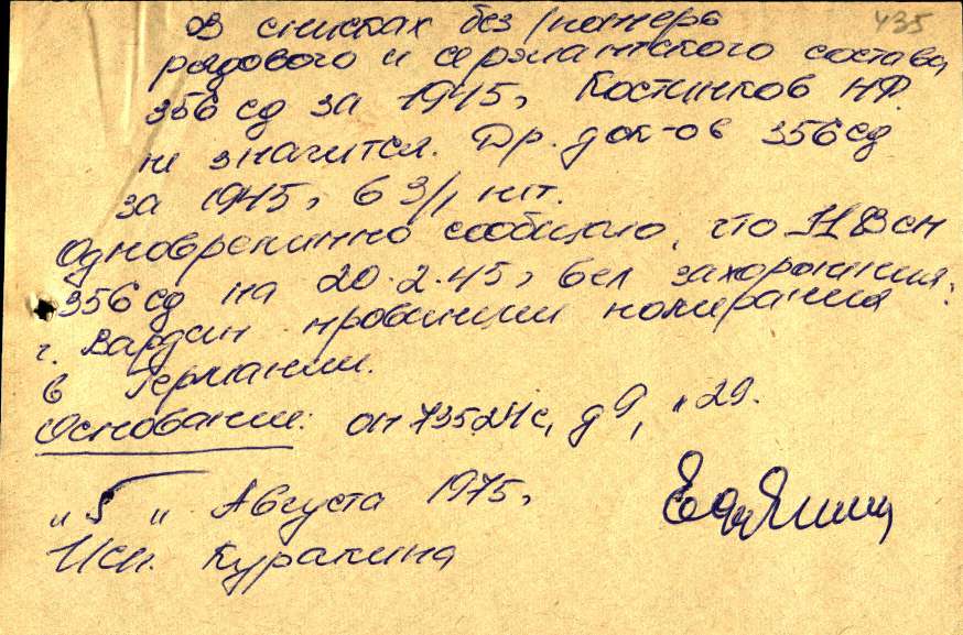 Спасибо всем кто откликнулся, я просмотрела всех перезахороненых из Вардына в Польше в г. Хощно, в списках нашла только Косленкова М.Ф. сержант,захоронен был в Вардыне, не могла ли произойти ошибка, в фамилии и инициалах и как можно удостоверится?