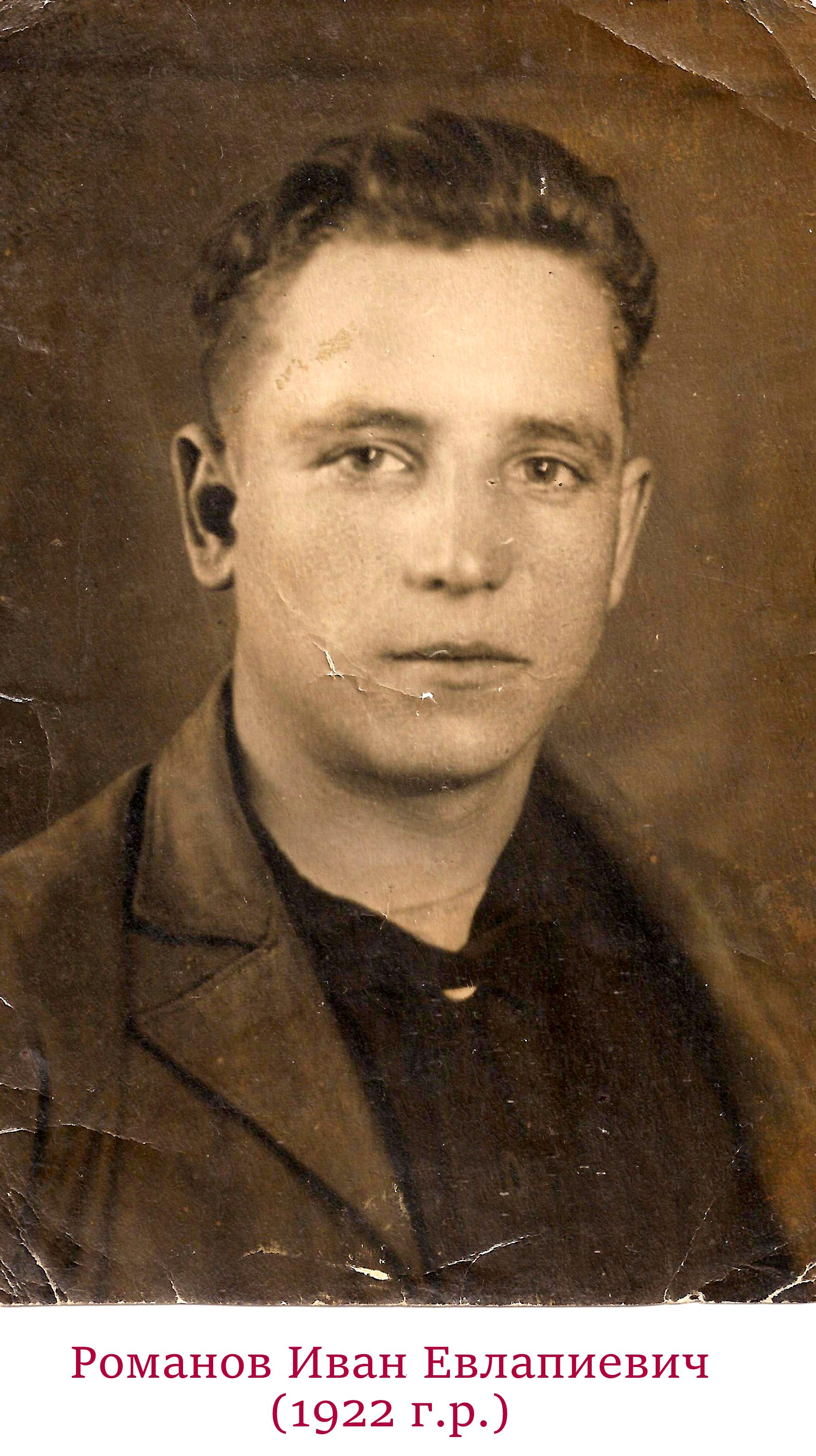 | Здравствуйте! Прошу оказать помощь в поиске пропавшего без вести Романова Ивана Евлампиевича 1922 года рождения, уроженца Калужской области, Ульяновского района, д.Слободки. Призван Сокольническим РВК Московской области(Москвы)26.10.1941года. Последнее письмо по адресу п/я 209-Г. По анкете дата выбытия 10.1942.  |