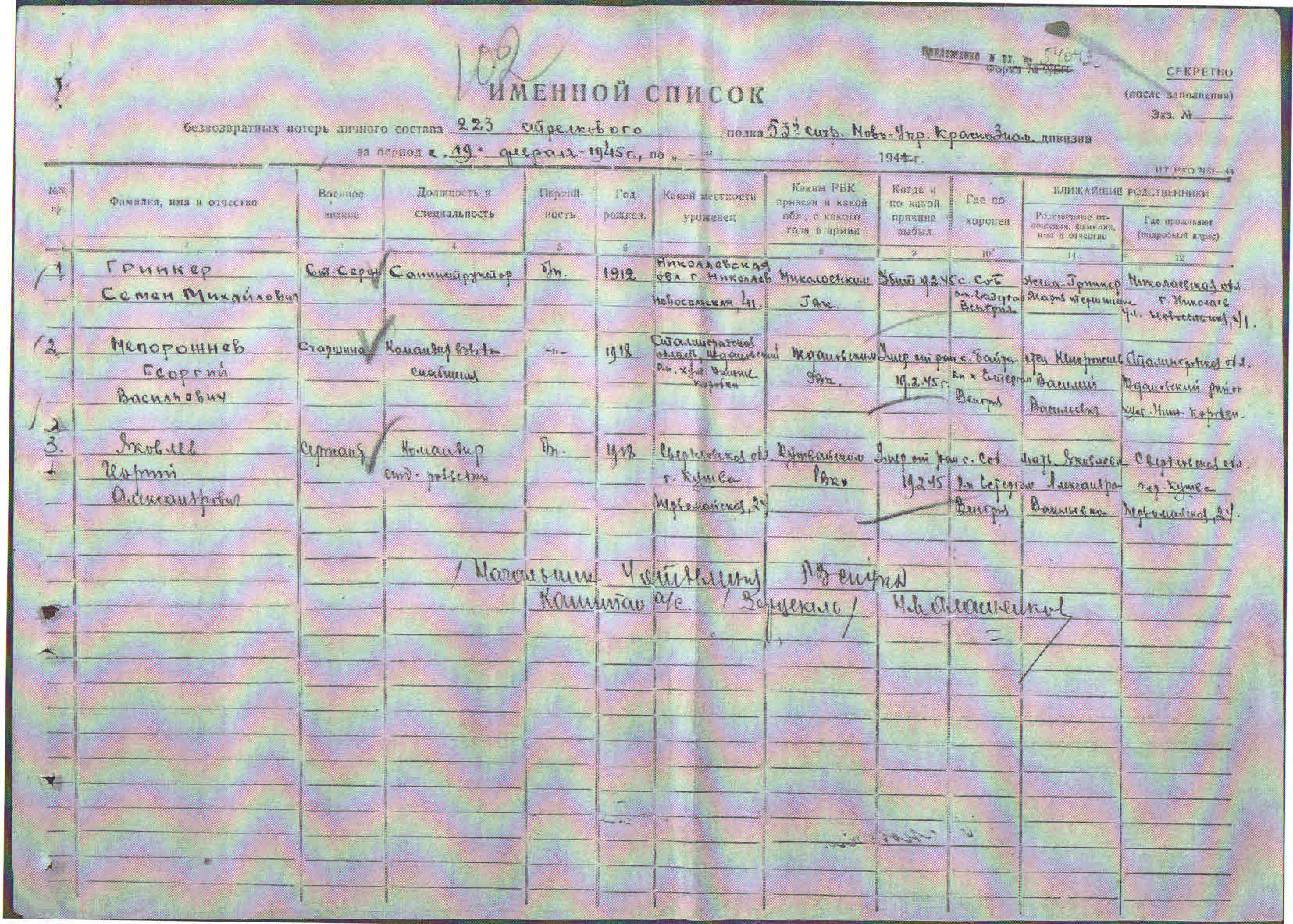 | Помогите пожалуйста установить точное место захоронения моего деда (может есть фото?) и, по возможности, установить его боевой путь. Он погиб 19-го февраля 1945-го года село Соб в Венгрии. По одним данным он был убит, по другим - умер от ран. Санинструктор 223-го стрелкового полка, 53 Ново-Украинской Краснознаменной дивизии.(файл прилагается) |