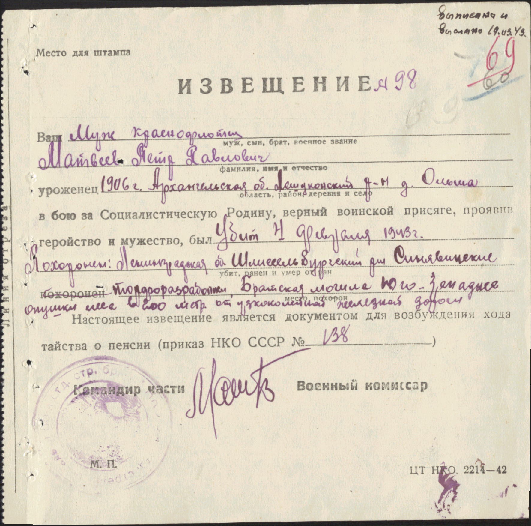 помогите пожалуйста найти место захоронения Матвеева Петра Павловича 1906гр.призван из Архангельской области Лешуконского р-на д.Олема.краснофлотец,погиб 04.02.1943г.похоронен в братской могиле в районе Синявинских торфоразработок