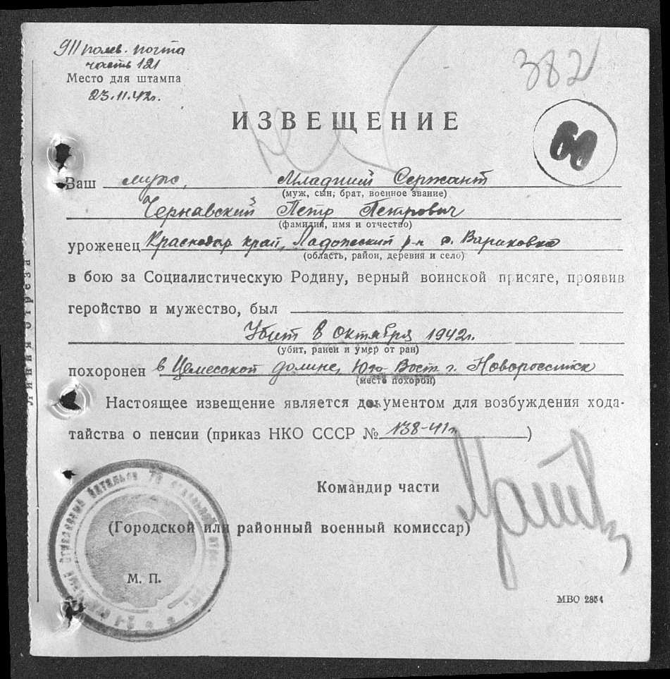Прошу помочь в поиске захоронения моего деда Чернявского Петра Петровича 1916 г.р. Призван Ладожским РВК Краснодарского края в августе 1941 года в сапёрную часть. Погиб 08.10.1942 в Новороссийске. Родственники: жена-Макаева Надежда Васильевна. Последнее письмо было в марте 1942. |