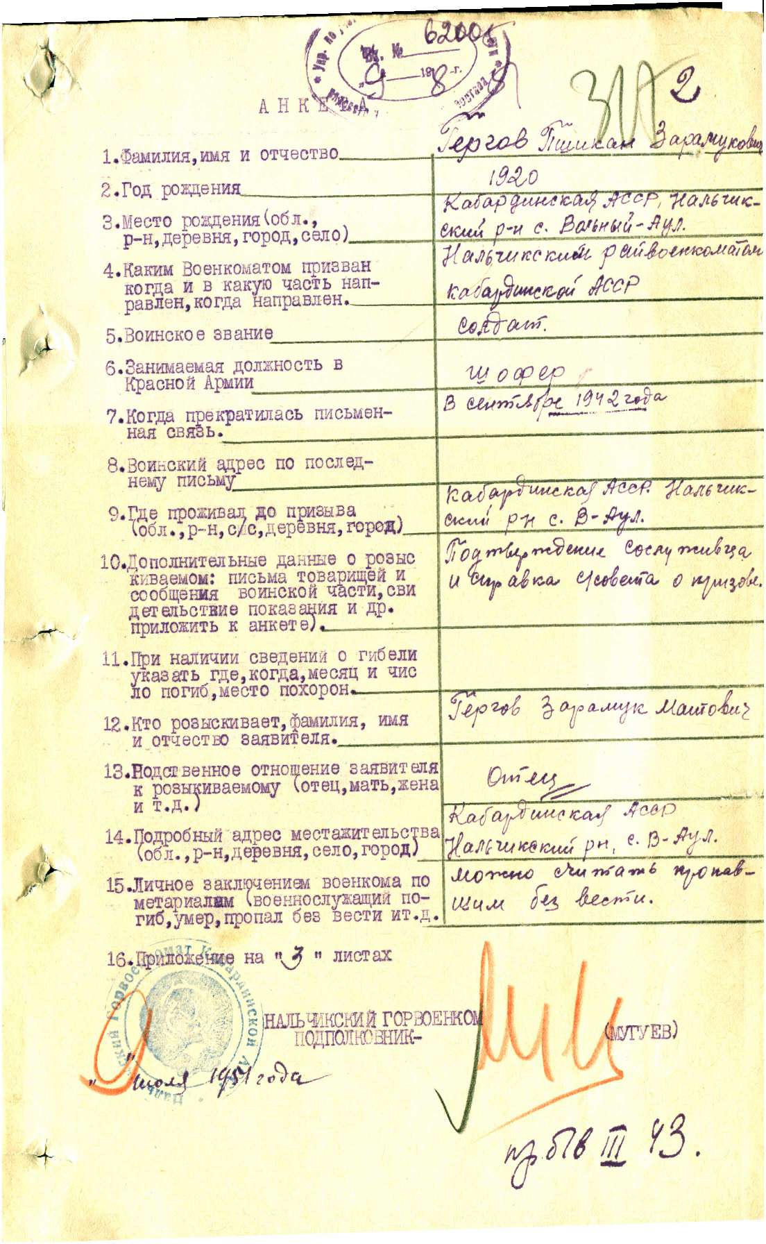 Дата и место призыва Нальчикский РВК, Кабардино-Балкарская АССР, Нальчикский р-н