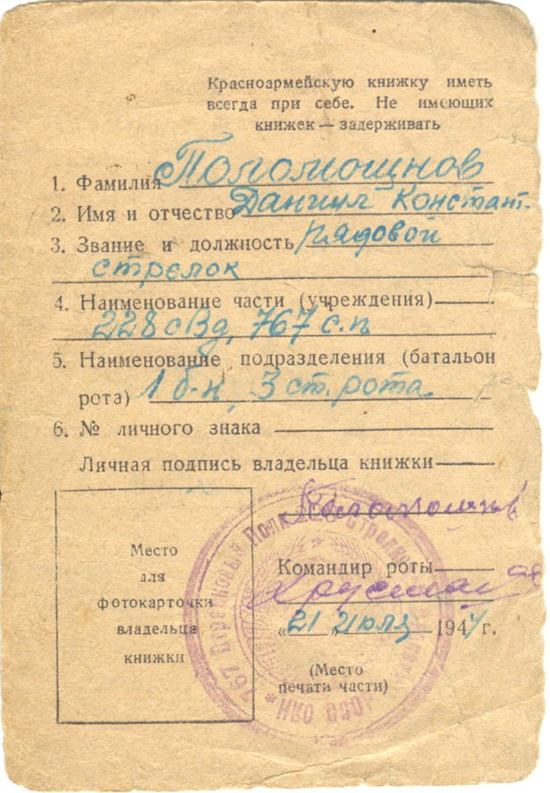 В красноармейской книжке указан 767 сп 228 сд (1941 год).