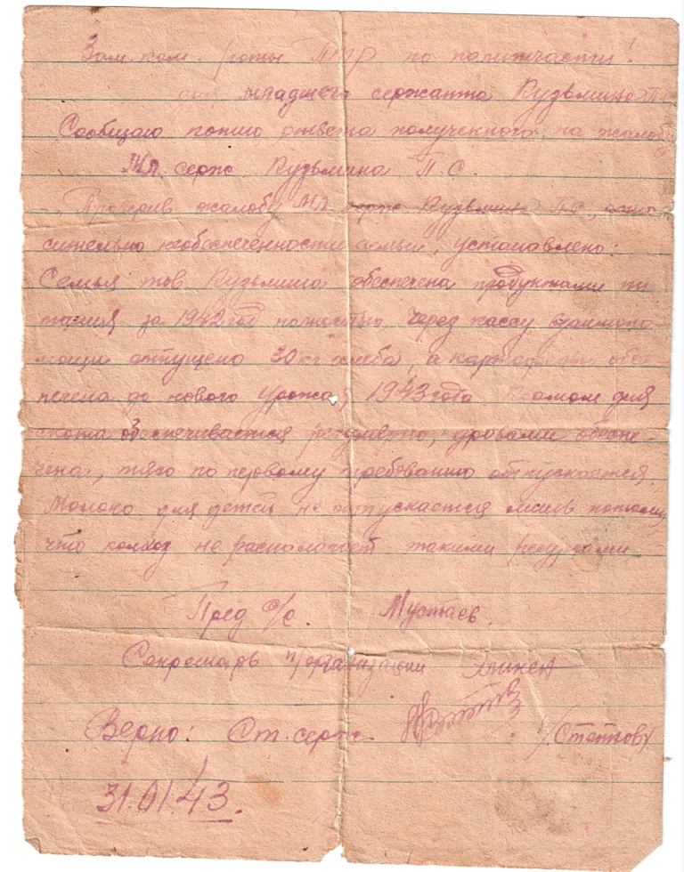 Пропал без вести. Дата выбытия в первом случае_.06.1942 ,во втором Дата выбытия __.04.1941 Одно из последних писем датировано:31.01.43г.В звание мл. сержант. Письмо прилагаю. |