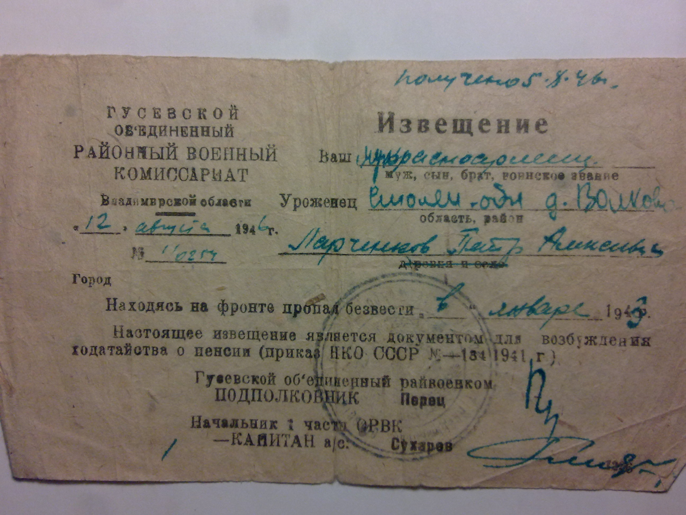 Дата выбытия указана ошибочно, т.к. имеется послевоенное извещение с датой "январь 1943", так же имеются его письма с обратным адресом "ППС 1588, 76 гв.ст.полк, 2-й батальон, 6-я рота", последнее датировано 21.10.42г. |