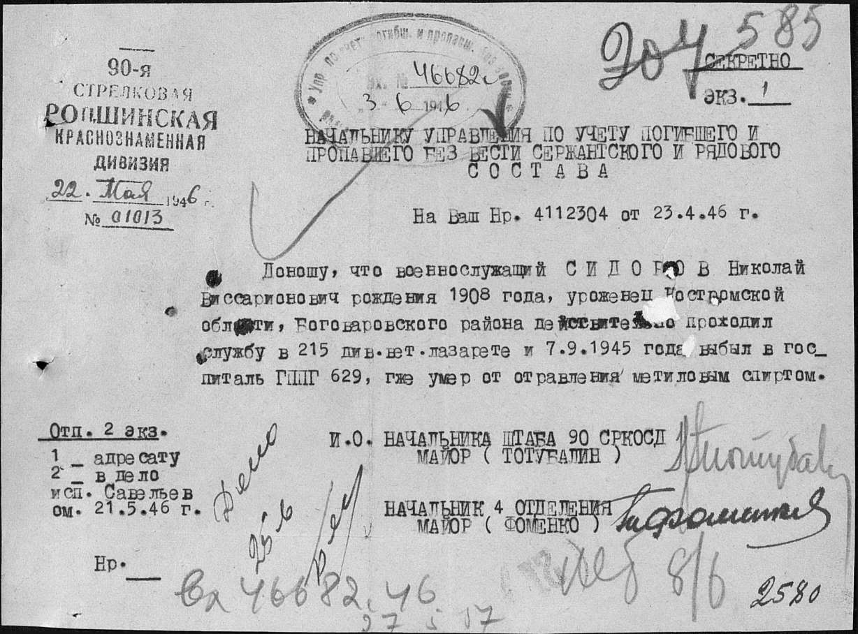 | Здравствуйте! к сожалению, моему дедушке так и не удалось найти место, где похоронен его отец, Сидоров Николай Виссарионович, после смерти дедушки у нас у всех остался долг и огромное желание найти его отца и побывать на его могиле. год рождения 1908, место призыва Волхомский РВК, Костромская область. проходил службу в 90 стрелковой Ропшинской дивизии, в 215 дивизионном ветеринарном лазарете. 07.09.1945 года выбыл в госпиталь ГППГ 629, где умер от отравления метиловым спиртом. награжден медалями "За боевые заслуги" и "За оборону Ленинграда" |