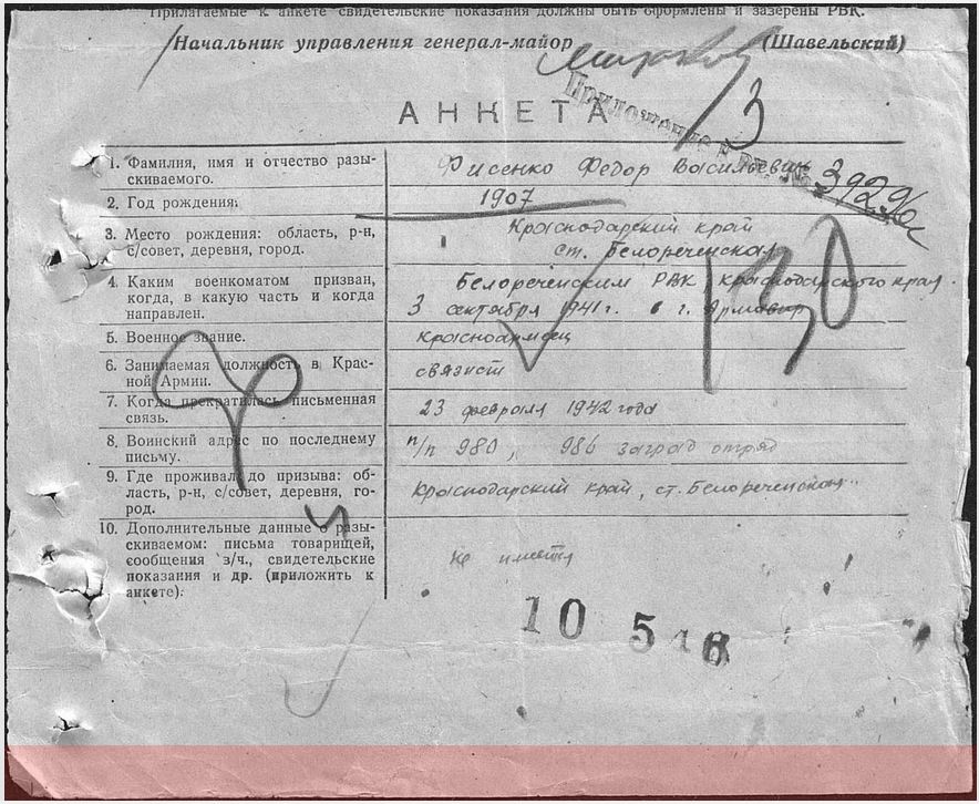 | Помогите установить судьбу прадеда Фисенко Федора Васильевича 1907 г.р. ст. Белореченская, Краснодарского края. Призван 3 сентября 1941 г. в г. Армавир, Краснодарского края. По данным анкеты появившейся на аналогичных сайтах с 23 февраля 1942 г. числится в пропавших без вести. Воинский адрес по последнему письму п/п 980 (986 заградительный отряд). Ближайшие родственники: жена - Плешкова Екатерина Акимовна 1905 г.р., мать - 1879 г.р. Гричаникова Ефимия Михайловна.