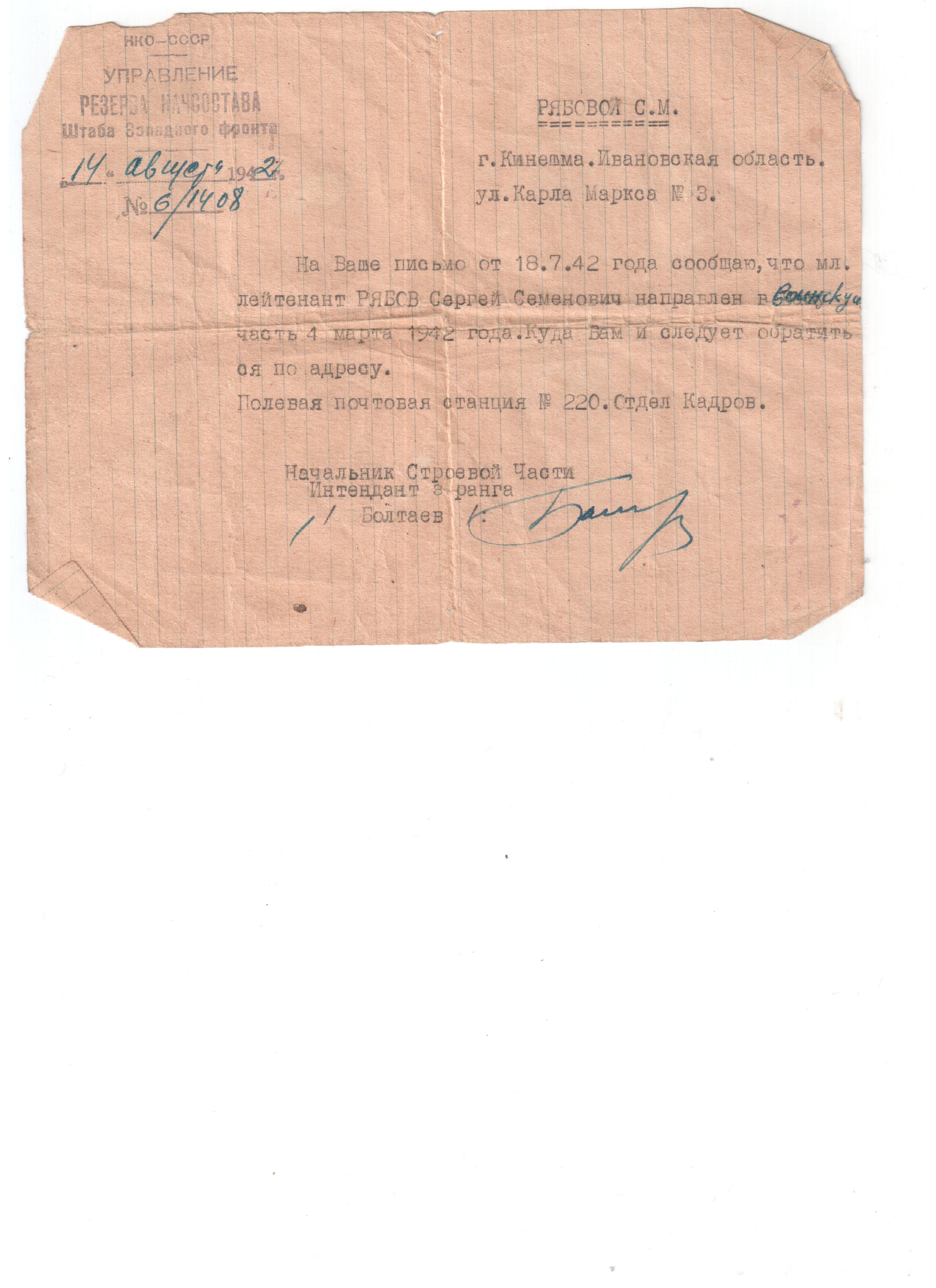 В письме Управления резерва начсостава Штаба Западного фронта написано, что мл. лейтенант Рябов Сергей Семенович направлен в воинскую часть 4 марта 1942 года. Куда Вам и следует обратиться по адресу. Полевая почтовая станция № 220. Отдел кадров.(скан письма прилагаю).