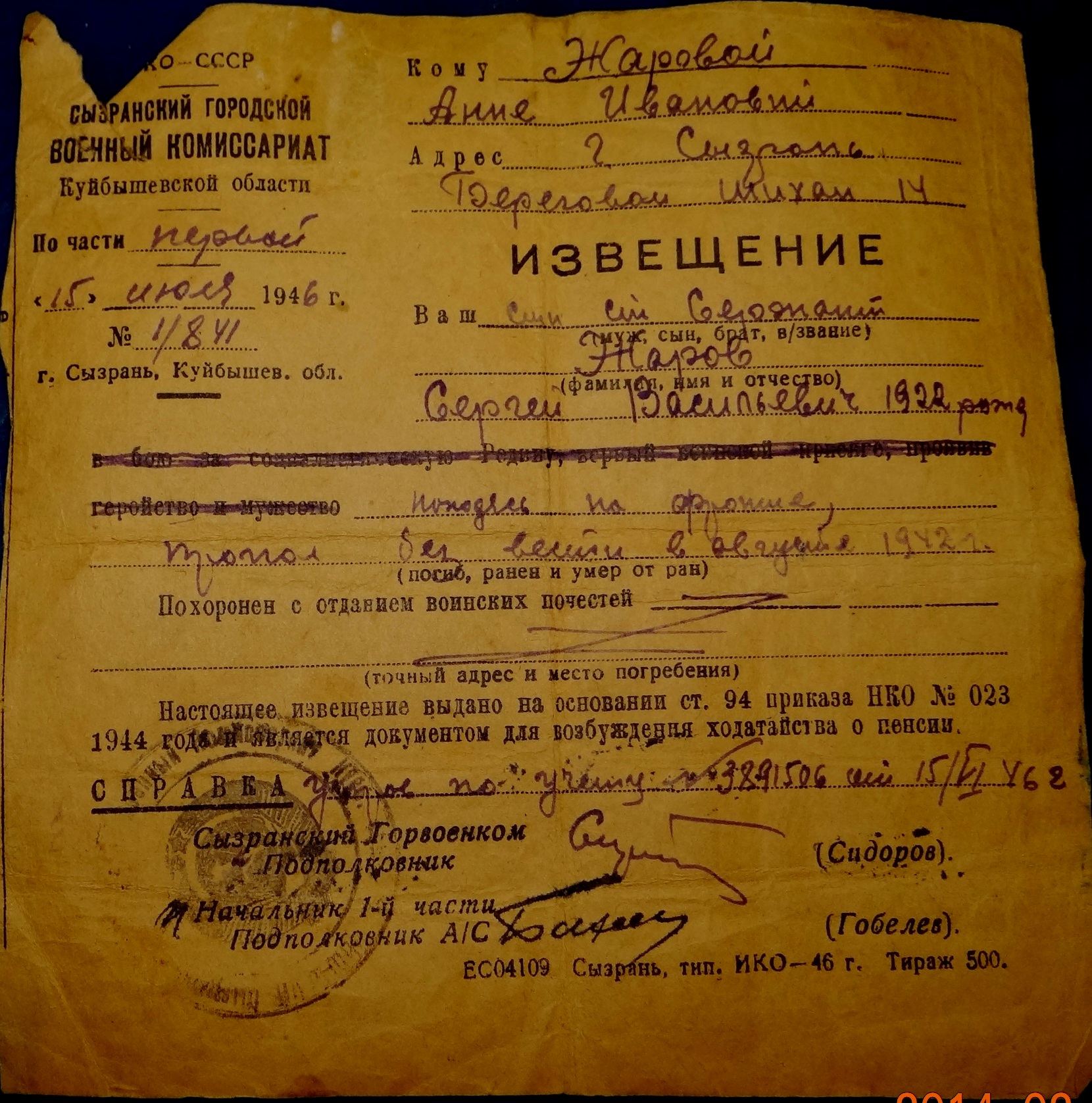 | Помогите пожалуйста найти моего дядю,Жарова Сергея Васильевича без вести пропавшего,ушёл служить 19 июня 1941г,их поезд разбомбилив первые дни войны в Белоруссии,он вышел из окружения,учился на минемётчика,присылал письма и фотографии из газеты, в 1942г пришло извещение ,что он без вести пропал.Бабушка(его мама)Жарова Анна Ивановна и моя мама(его сестра)Семёнова Нина Васильевна искали его до конца 60тых годов 20в |