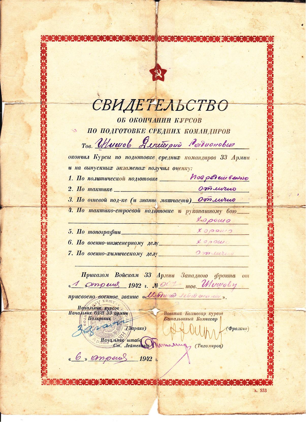 Согласно приказу Войскам 33 Армии Западного фронта №097 от 01.04.1942 присвоено звание Младший лейтенант.