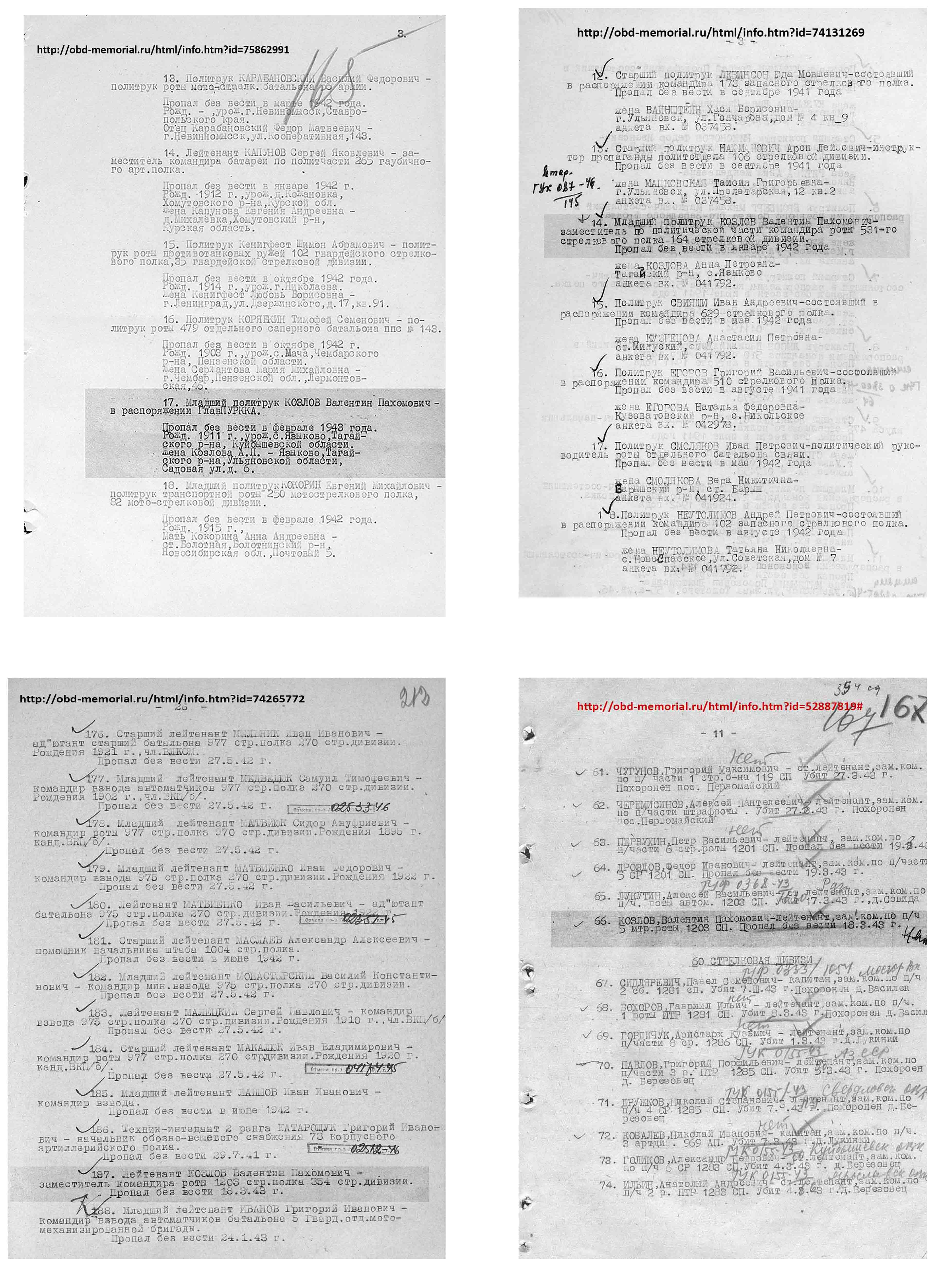 | Козлов Валентин Пахомович 1911 года рождения, с Языково, Тагайский район, Куйбышевская область. Супруга Козлова А.П. Пропал без вести по разным источникам в разное время, помогите узнать где может быть захоронен. В ОБД-мемориал нет данных о захоронении. Я его внучка. Ссылки на документы указаны в первой строке каждого листа.