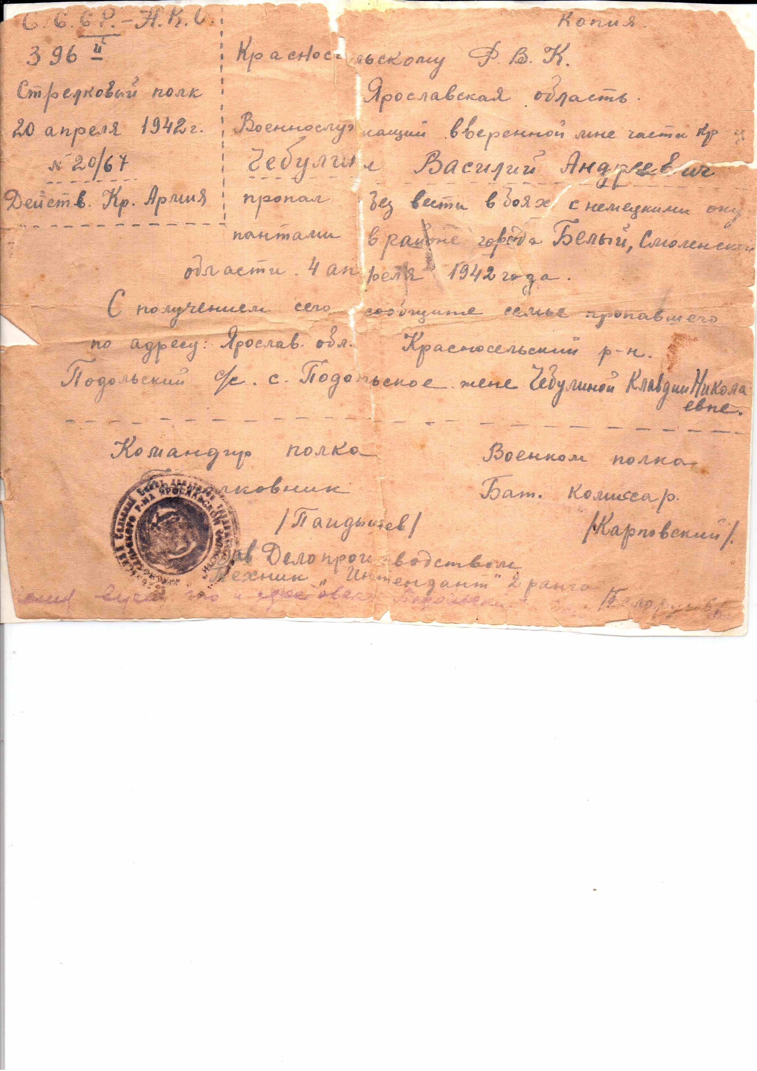 | Помогите, пожалуйста, найти информацию о нашем дедушке Чебулин Василий Федорович ( в похоронке отчество Андреевич - это отчество его отца)Родился 21.12.1909 г. Костромская обл. Красносельский район с.Подольское. Призван в июне 1941 г.Красносельским РВК Ярославской обл. ( ныне Костромская) Проходил службу в 135 стр. дивизии п/п 92431. Жена Чебулина Клавдия Никадровна 1905 г.р. В похоронке написано пропал без вести, на ОБД мемориал информация, что попал в плен 02.04.1942 г. .https://www.obd-memorial.ru/html/info.htm?id=63654871. Самостоятельные поиски никаких результатов не дали |