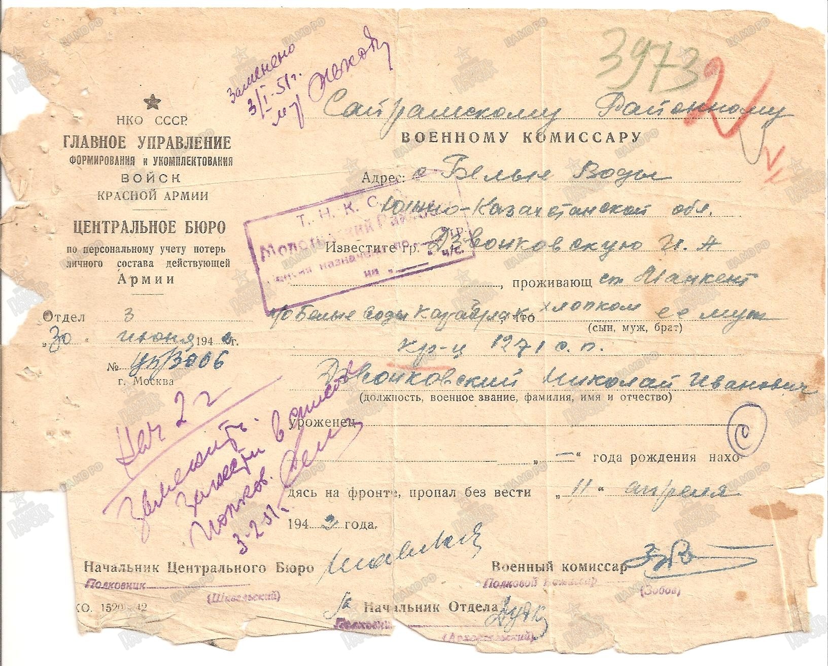 | Ищем прадеда, Дзвонковский Николай Иванович, служил в 387-й стрелковой Перекопской дивизии в составе 1271-го стрелкового полка, звание красноармеец. Пропал без вести 11.04.1942г., в книге памяти числится погибшим от 11.04.1942г. В журнале боевых действий 387-й стрелковой Перекопской дивизии указано, что 06.04.1942г., стрелковый пол 1271 удерживал высоту 165,о и лес 800м северовосточнее. Недалеко от деревень Тургеньевка и Чухлово Калужской области. |