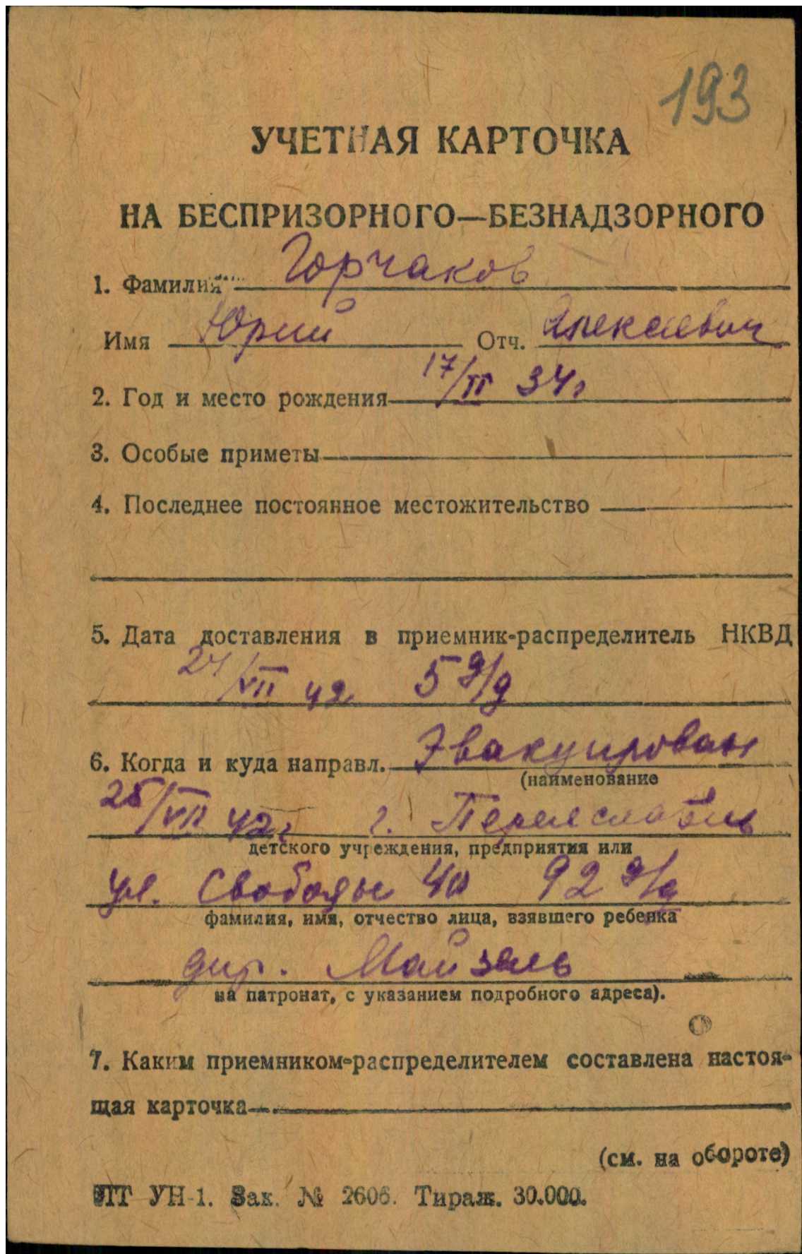 | Здравствуйте! Ищу информацию про своего прадеда, Горчаков Алексей Васильевич, год рождения 1906 или 1909. Работал в Ленинграде инженером на заводе. Призвали в РККА прямо с работы в 1941 году, жена: Горчакова Наталья Николаевна, умерла в блокаду 1942 году, сын эвакуирован в 1942 г. из Ленинграда в Переславль. Прикреплю фаил с распределительной карточкой его сына (моего деда). |