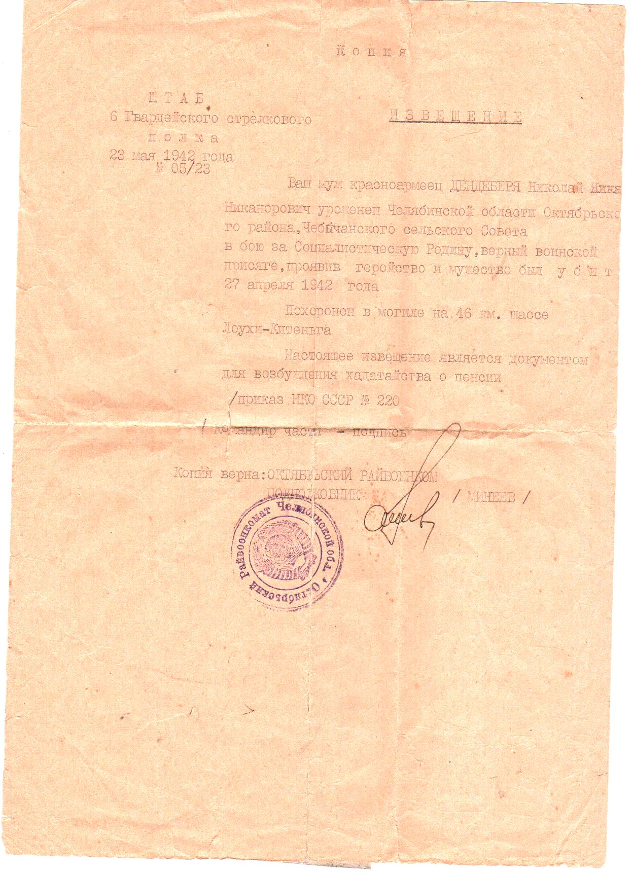 Гв. рядовой 66 гвардейского стрелкового полка. Погиб 27.04.1942г в Карелии на 46 км. шоссе Лоухи-Китеннга /так написано в извещении/. Кроме похоронки, нет ничего в ОБД. Помогите найти ещё какую нибудь информацию. СПАСИБО!