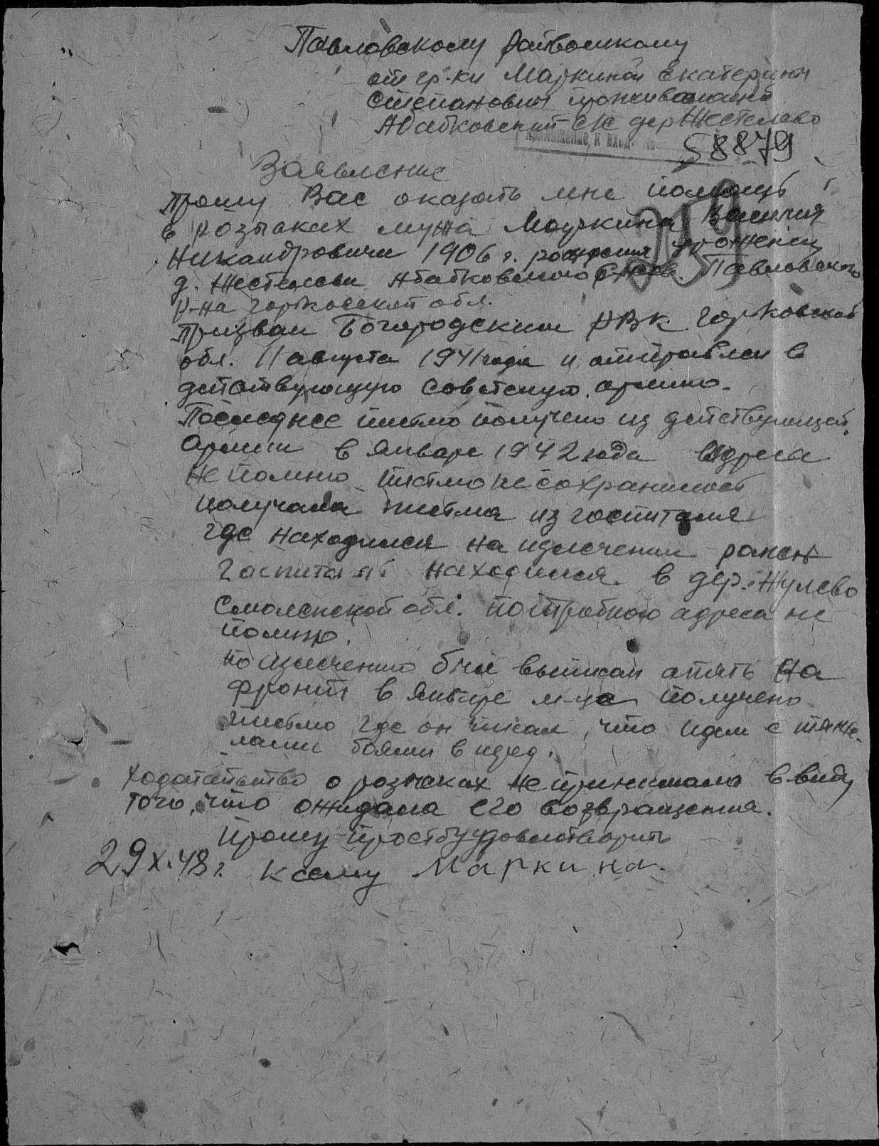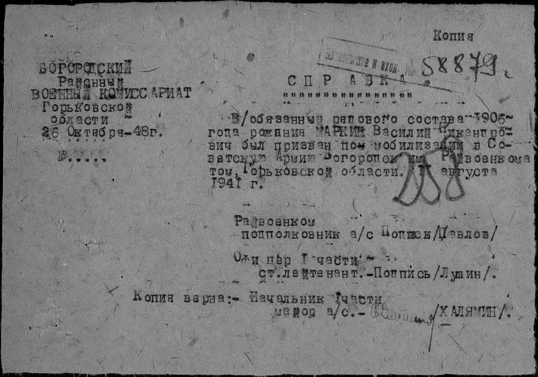Добрый день. Помогите найти Маркина Василия Никоноровича 1906 года рождения, погибшего в январе 1942 в городе Павлово