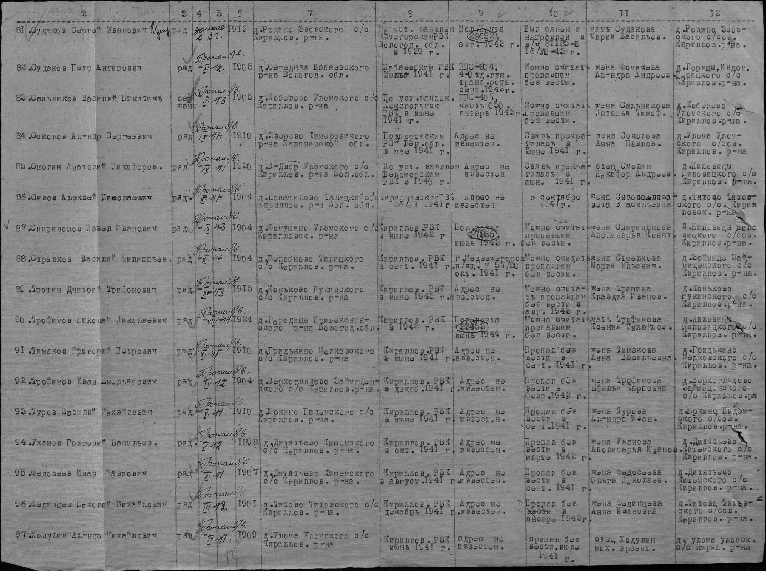 Дочь Барнуковская (Фединцева) Тамара Николаевна ищет любую информацию о своем отце Фединцеве Николае Михайловиче 1902 года рождения. В 1941 был призван в армию военкоматом Кирилловского района Вологодской области. Пропал без вести в сентябре 1941г. на Ленингралском фронте (со слов матери). |