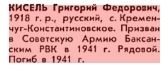Кисель Григорий Федорович год и место рождения 1915 КБАССР Прималкинский район с.Крем-Константиновское призван - 1937 кубинским рвк мать - Кисель Марфа Михайловна. Помогите найти дядю моей свекрови. От своей мамы - родной сестры Кисель Григория Федоровича, она знала лишь то, что он попал под бомбежку под Ростовом в 1941 году (на сайте МЕМОРИАЛ дата смерти 1943) , где и погиб. Информацию предоставил односельчанин. Он на момент гибели видел, как тот упал. Больше ничего не известно. Помогите найти могилу, где он похоронен. На сайте Память народа нет никаких данных. Фото не сохранилось, нет вообще ничего, ни писем, ни номера части. |