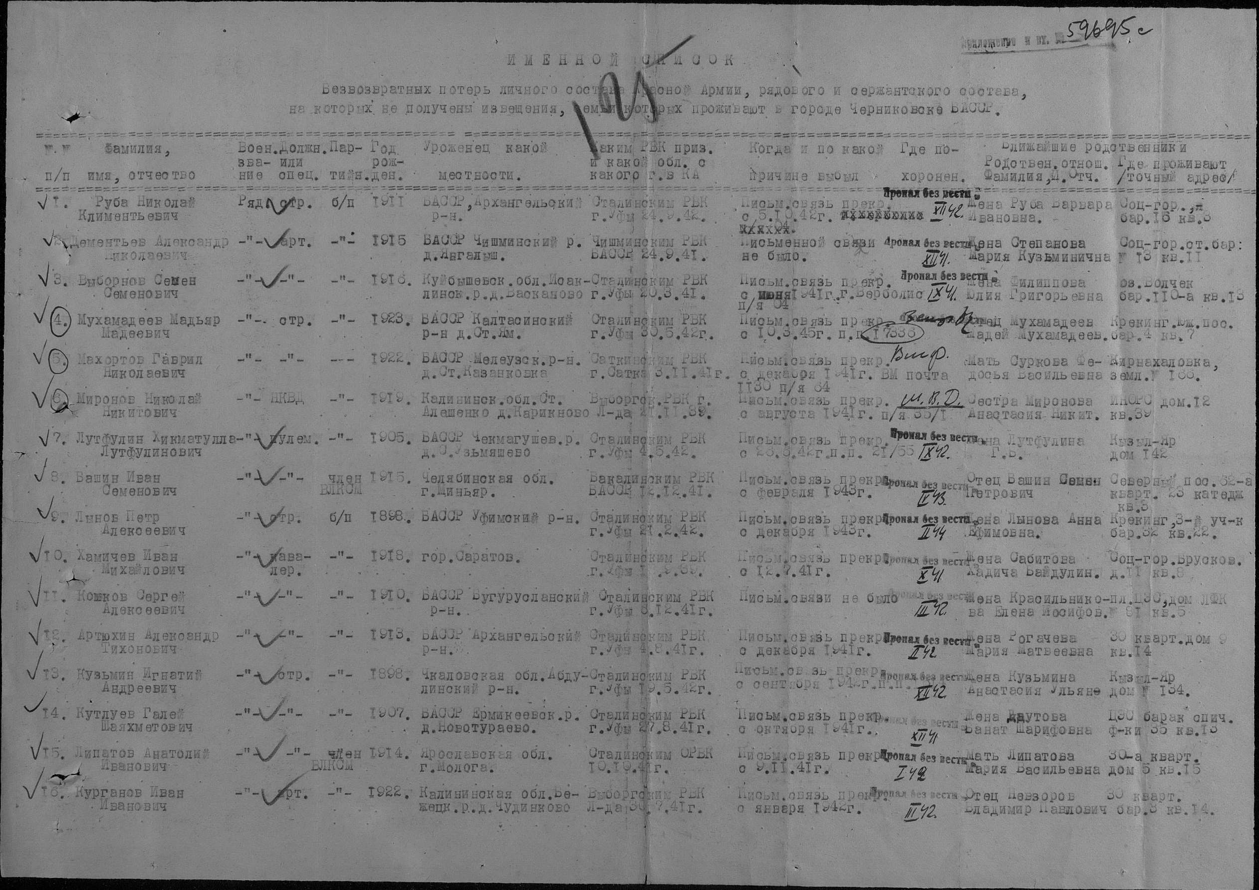 Добрый день. Родной брат моей бабушки рядовой Липатов Анатолий Иванович, родился в г. Молога Ярославской обл. в 1914 году. Призван на фронт был Сталинским РВК г.Уфы 27.08.1941г. Связь с ним прервалась 9.11.1941г. Помогите найти информацию: примерное место гибели, воинская часть, любые другие данные. Не сохранилось даже его фото. В именном списке безвозвратных потерь личного состава числится ПРОПАВШИМ БЕЗ ВЕСТИ с января 1942г. |