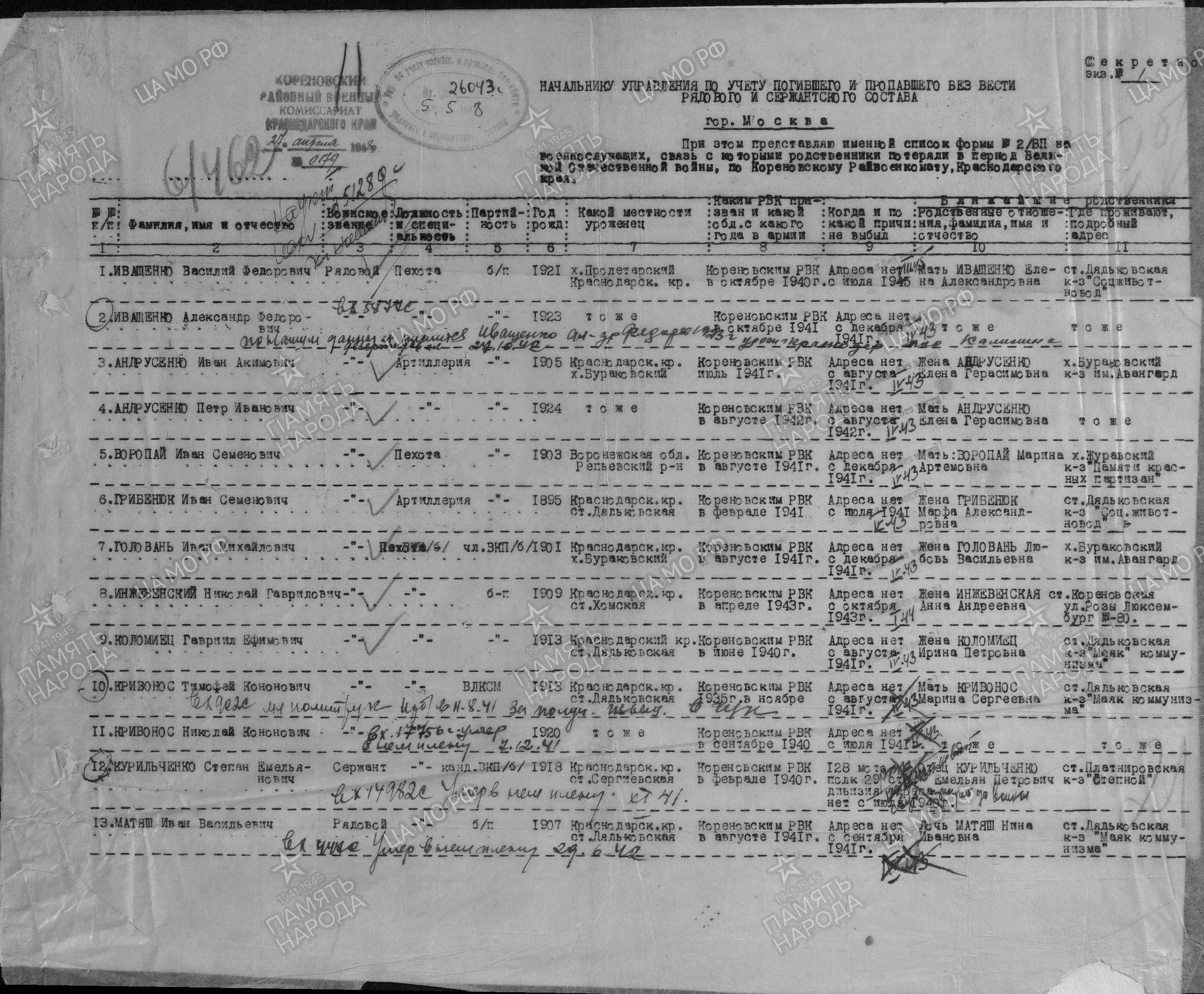 Ищу информацию о своем дедушке, 1901 г.р. уроженца х. Бураковского Кореновского района Краснодарского края. До войны дедушка проживал в х. Бураковском, был председателем колхоза. Призван в армию 1 августа 1941 года Кореновским РВК. Рядовой. Пропал в 1943 году. Спасибо!... Надеюсь на Вашу помощь